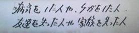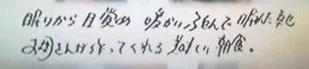 病気をした人や、ケガをした人、家族を失った人、そんな人たちが前を向いて歩き出した時 あたりまえ病 に気付く人がいるのではないでしょうか!!私は、ただ時を過ごす、平和な生活におんぶしてしまっている人を あたりまえ病 と言っています。こんなエラそうなことを言っている私もあたりまえ病のひとりなんですけど・・・でも気がついたんです。眠りから覚め、暖かいふとんで眠れた幸せお母さんが作ってくれる美味しい朝食。自分たちがなんの気なしに毎日している事又してもらっている事全部もう一度振り返ってみてください。私たちの身近にある“小さな幸せ”が本当はとても“大きな大きな幸せだ”ということに!