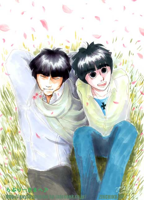スミマセン!小出しで・・・。【13歳年上】眉間にしわを寄せて対峙していたガイの表情が、リーの涙に溶かされたように緩む。「リー・・・!」(来い!)ガイは、大きく両腕を広げて、リーを呼んだ。「ううっ・・・ガイせんせぇ~~っ!!」(僕、僕・・・修行して、たくさんたくさん、修行してっ、絶対、先生に追いついてみせますっ・・・!)1歩、2歩、3歩・・・。リーは走りながら、両腕をさし伸ばした。7歩、8歩、9歩・・・。ガイは父親のような穏やかな笑顔で、駆け寄るリーに向けて両腕を伸ばした。10歩、11歩、12歩・・・。二人の手が、しっかりとお互いをつかんだ。13歩・・・!!向かい合って、リーの腕をつかんだガイは、そのまま体をひねるようにして、ありったけの力でリーを放り投げた。180度、後方へ。リーは膝を抱えてくるくると何度か回転をし、着地した。あのまま、いつものように師とかたく抱き合って、感動の涙に暮れるものだと思っていたリーは、文字通り「鳩が豆鉄砲を食らったような顔」で、ガイをふり返った。「・・・ガイ・・・先生・・・?」先ほどの、13歩の距離よりかなり先へと飛ばされたリーは、後方のガイを見遣る。師は、ナイスガイ・ポーズで親指を立てながら、大声で叫んでいた。「リーよ!!それが、お前の、14歩目だぞーーーッ!!!」最初は意味が解らないといった顔をしていたリーの、表情が、くしゃくしゃと歪んでいく。「ヤ・・だ。先生が、あんなに、遠い・・・なんて」再び、涙が溢れ出す。拳で拭いても拭いても、止まらない。ガイに、師に憧れ、敬愛し、同じように強く、立派な忍者になりたい。それだけを思ってきた。だけど、師を、追い越してしまうなんて。想像もしていなかったリーは、どうしていいか解らず、膝が震えるに任せたまま、立ち尽くしていた。【続く】