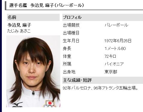 しろくま夫です。今晩は。世の中、すごい年の差夫婦や、うちのように同い年の夫婦がいますが。先日、同い年の夫婦の強みが発揮されました。仕事を終えしろくま嫁へ電話、「これから帰るよ」「ハーイ」おりしもその日はGW真っ只中。その頃、しろくま夫の両親は出先からの帰路にあり中央高速道路の上でした。私が、しろくま嫁に電話した数分前に嫁に電話があったそうです。「今どの辺にいるっていってた?」「えーと、えーと、どこって言ったけ? あ、あのー、ほら、バレーボールの全日本にいた、ほら」「た・じ・み?」「そう、そう、そう。あはははは・・・・・. 多治見! 」みなさん、覚えてらっしゃいますかこの人、1990年全日本代表初選出。1992年バルセロナオリンピック、1996年アトランタオリンピックと五輪に2度出場。1998年世界選手権で主将を務めた。1999年1月に左ひざの手術を受けた影響でシドニー五輪予選に間に合わず、Vリーグでも99、00年シーズンと本来の活躍ができなかった。2007年4月、Vリーグ出場試合が佐々木、内田と共に女子選手歴代4位の232試合(当時)となり、リーグ40回大会を記念し創設された『Vリーグ特別表彰制度』で長期活躍選手として特別表彰された。2007年4月、8年ぶりに全日本代表復帰。同年開催のワールドカップ韓国戦に途中出場した。2008年8月、アトランタオリンピック以来12年ぶりに北京オリンピック出場を果たした。うちら夫婦はにわかヴァレーボールファンでありまして、オリンピックがちかずくとファンになります。そんでもって二人とも彼女のことは知っているのです。しかも私たちと2歳しか違わず、世代は一緒。そんな彼女のことを持ち出し地名を引き出すなんて、まさに同じ年の強み。こんなうちらはやっぱおかしいですか?