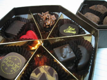 ↑わはは コレが私がダンナにあげたチョコなのよん。(=自分が食べたかったチョコでもある)昨日の深夜に仕事疲れでぐったりとして帰宅したダンナに「コレコレっ チョコチョコ 開けてみて」と間髪いれずに催促した私。要は自分がどうしても食べたかっただけ。えっ・・・と 名前はなんだっけ?"レ・グラン ショコラティエ"??MOF(フランス国家最優秀職人)の称号を持つパティシエ・ショコラティエ集団の作品でございますことよ。あ~た、2段重ねですよっ2段重ねっ弁当みたいだわ。味はそりゃ美味しいに決まってますわな。冷静に考えればチョコになんでこんなに金かけたんだろう、私・・・って感じもあ~りあり。(見た目華やかゴージャス&肩書きにめっぽう弱し)で 私自身も今日"チョコ"を頂きましたの。しかも手作り。うちに来ているお客様(女性)が娘さんと一緒に作ったそうでその娘さんのお相手もやはりというか女の子同士。「友チョコ」流行ってるみたいですね~(あ、でも私も"友チョコ"かぁ?) チョコづくしで鼻血ブーになりそ?