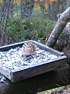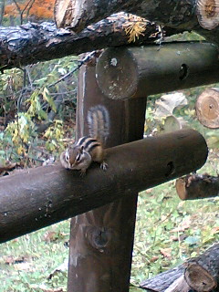可愛いお友達に会いました♪シマリスさん♪かなり離れていたんですよ静に近ずくと忙しそうに手と口を動かしていました。食事中でした。もう冬支度を始めたのかな?
