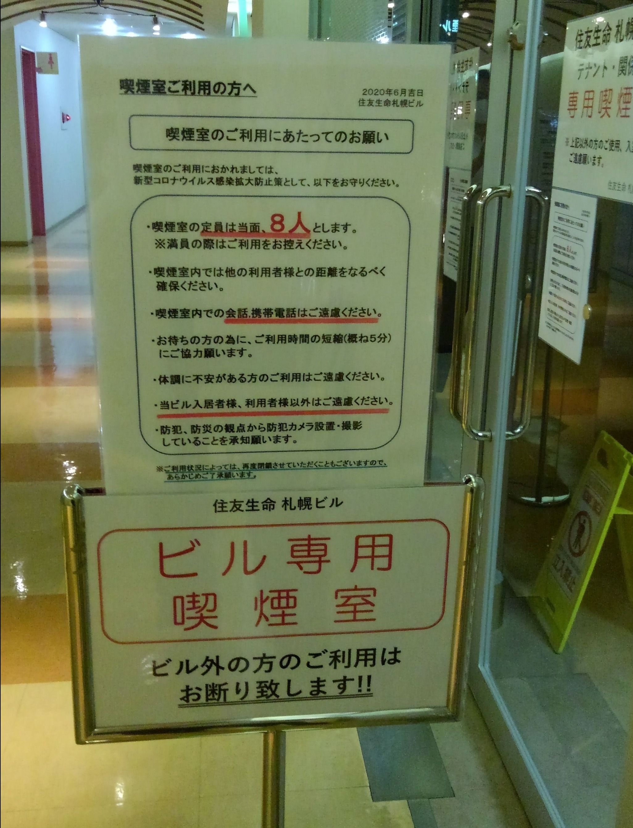 住友生命札幌ビルの喫煙室が再開されていた。ビル外の方のご利用が多いのだろうな。私は喫わないので関係ないけど。