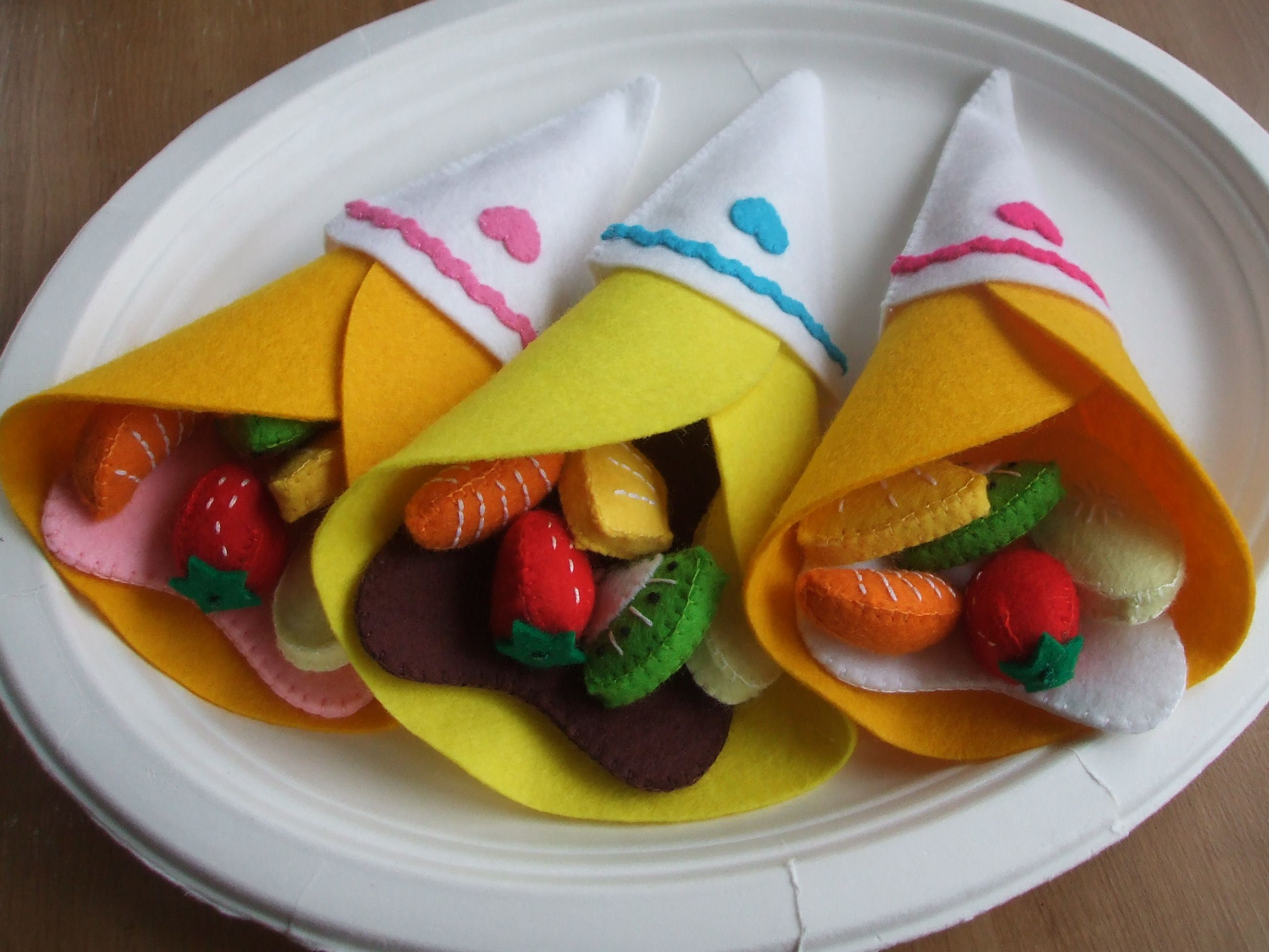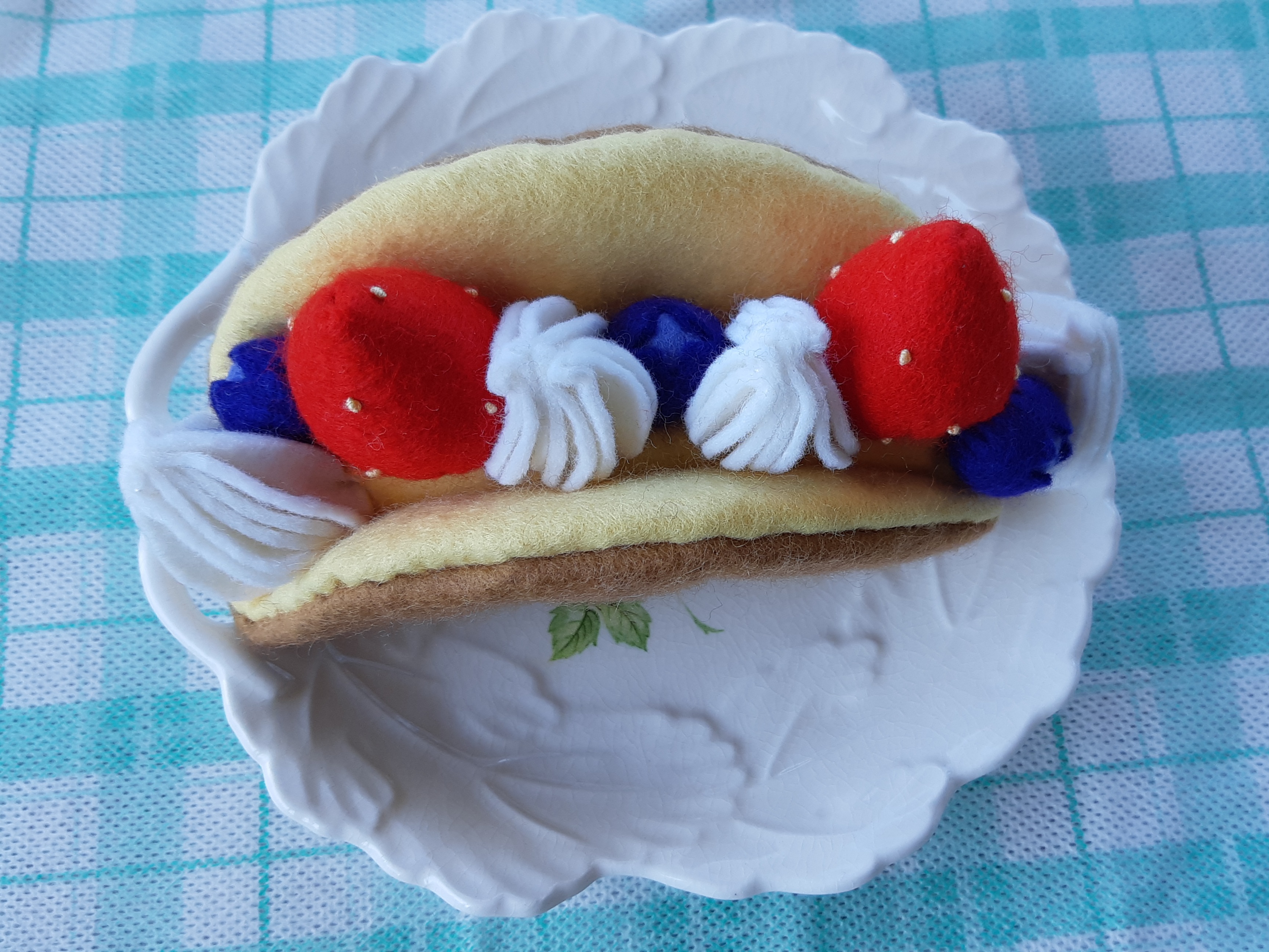 トッピングのフルーツやクリームがコロコロ落ちるので、前から見えないように待ち針で止めて撮影しました。(* ´艸`)クスクス