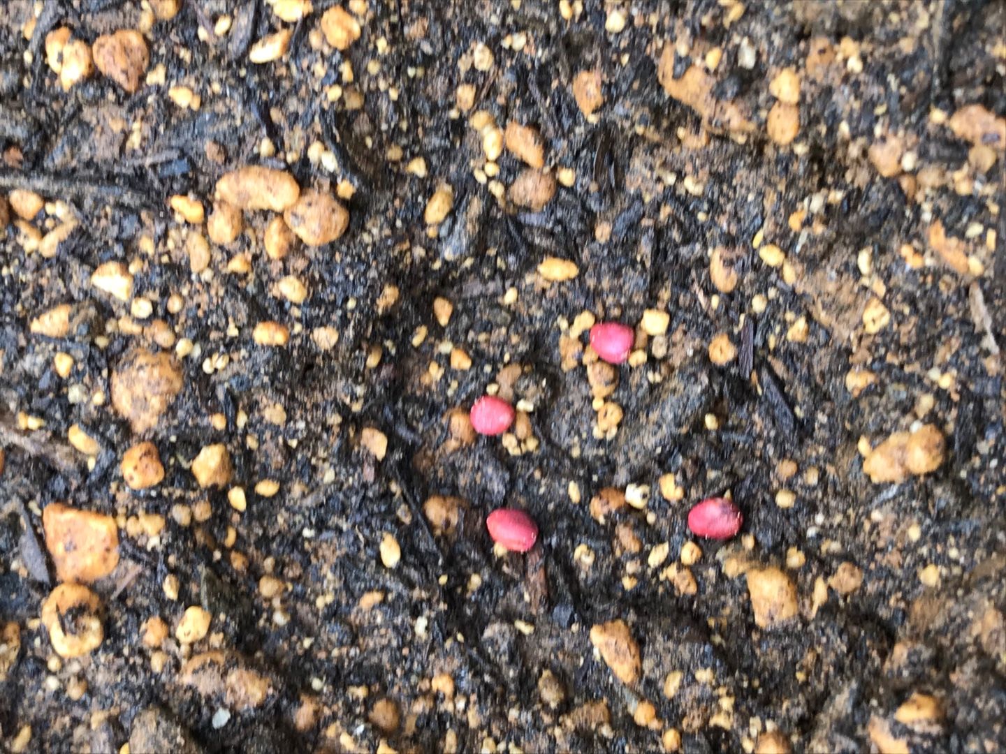 一か所に4粒の種を植えます。種は色付の防腐剤でコーティングされています。