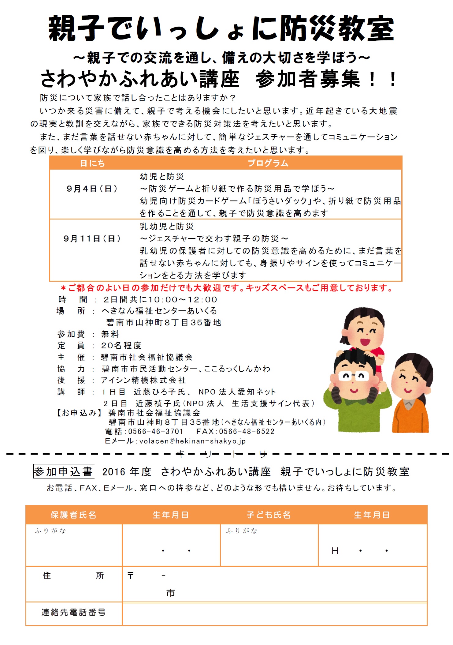 乳幼児をお持ちのお母さん、お父さん向けの講座です。 小さいお子さんがいるとなかなか防災訓練や講座を受けることが難しいのですが、災害が起こる前に、毎日の暮らしの中で災害時にも役立つサインを使いながら防災力を高めていただける内容です。 大人だけの参加、碧南市外からの参加もできます。 この機会にユニバーサルサインを身に付けてみませんか? 日時 9月11日(日)10時~12時 場所 へきなん福祉センターあいくるあいくるお申込み、お問い合わせは... 碧南市社会福祉協議会(℡ 0566-46-3701)