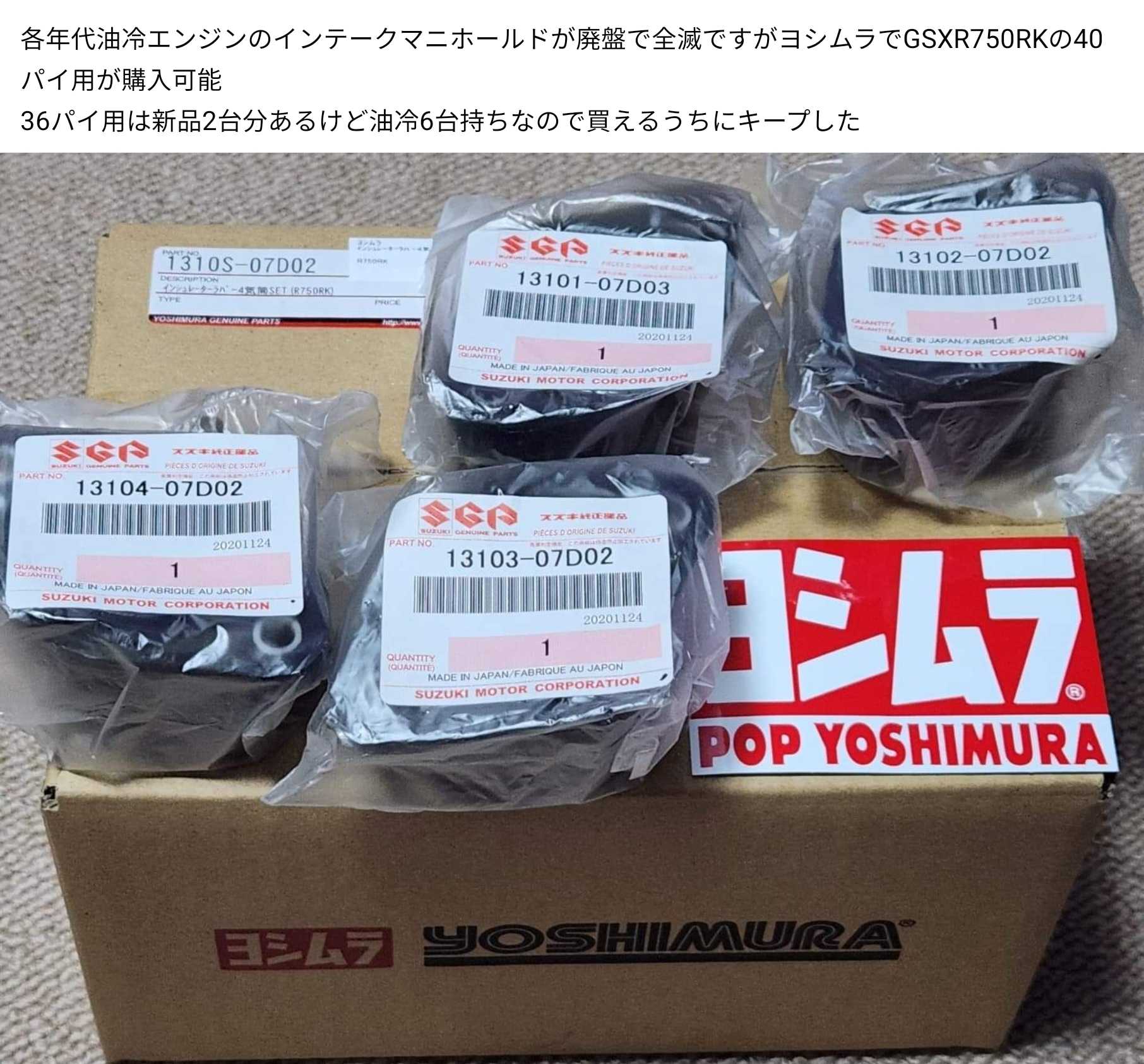 ヨシムラのGSXR750RK用のマニホールド到着廃盤のスズキ純正部品をステッカーと共に箱詰めセットにするとヨシムラ純正になる廃盤品を供給続けてくれてるヨシムラに感謝バンディット魔改造1400はインジェクションでキャブレター用のマニホールドが無いためアルミ板とアルミパイプろう付けして自作したけどレースベースとしての500台限定者の部品が買えるのだから利用しない手はない1100とはほぼ同じながら若干上にオフセットされているのでフレームに当たって使えない場合もあります自分の油冷最終1100は廃盤前にマニホールド交換済なので問題なしですGSXR1100Nに余ってるTMキャブのどれか付けても良いんだけれど面倒くさいと思う程度の興味です所詮750レプリカの5速のツアラーだしね