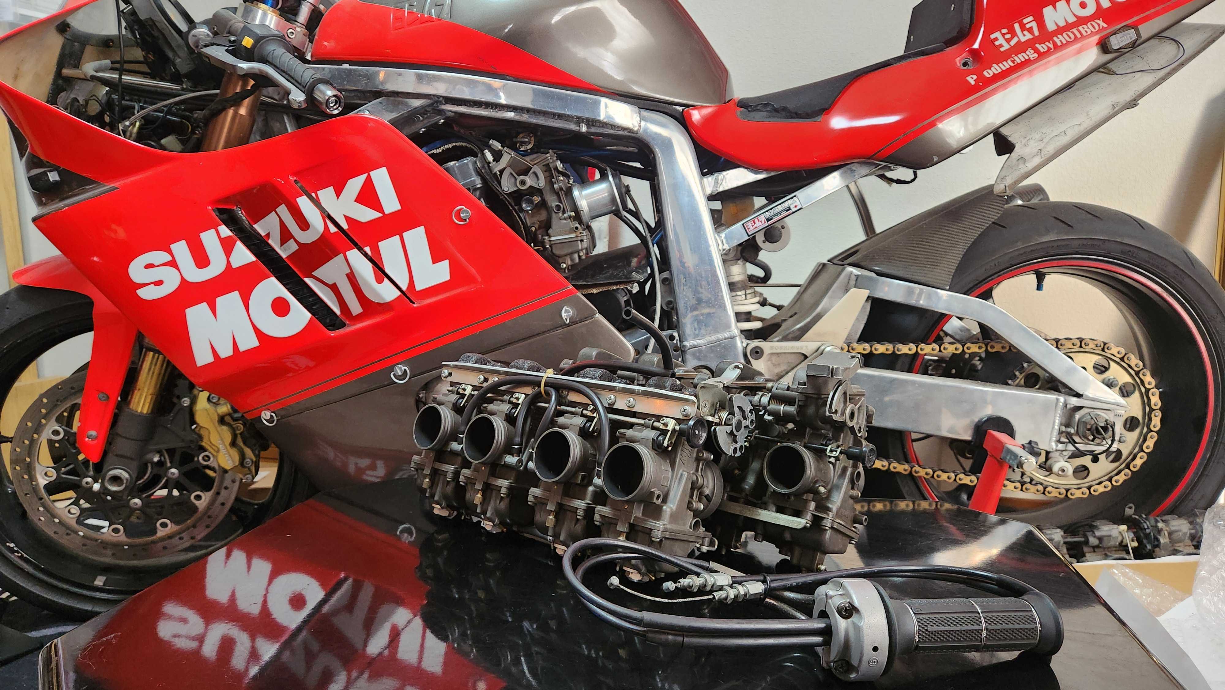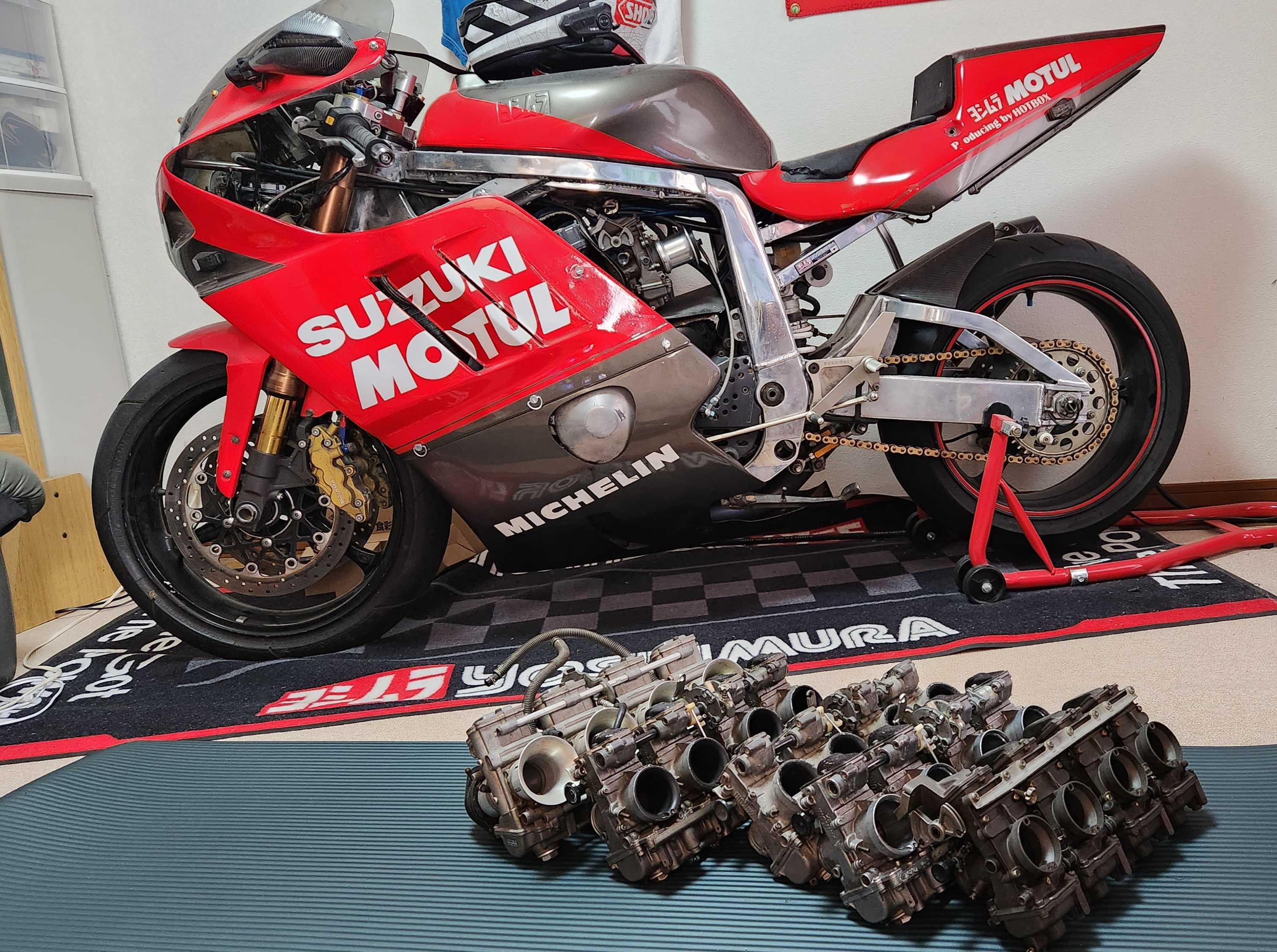クソ忙しいストレスを発散するにはオートバイ製作中の油冷最終GSXR750にどのキャブレター付けようか思案(この車両はGSXR1号車)TMR40~TM40~TM38~TM36~TMX34ワークス御用達!ヨシムラのレーシングキットパーツでもあるサイドリンクのTMX34はワークス御用達GSXR1号車にはもちろんTMX付いてますTMXはワークスも使うだけあって恐ろしく高性能なのですがワークス乗ってた開発ライダーの話では34~40パイまであったそうで当時のスペシャルキャブは200万とも言われてたとかそれは初期型R705の時代だから89RK以降の高回転エンジンならポート形状も違うし40パイの方が良いのかなと思ったりしてたんです昔ヨシムラで人知れずレース関係者に国内20セット限定でTM40売られていたんで40パイに興味がありました当時30万位だったと記憶してますTM40は手持ちであれどやっぱTMX付けたくなるほどサイドリンクや当時のレースシーンへのリスペクトもありますやっぱTMXかなと思ってたらGSXR750RK用のサイドリンクTM40が出品!これ安いしむちゃくちゃレアだと思って競りあがるかなと思ったら誰も入札しないwえっ?俺買ってもいいの?買っちゃうよ?仕事の疲れを癒やすためだと自分に言い訳して購入変に削り出してワンオフ感あるより昭和的なスロットルも味わいがありこのハイスロは1号車に使いたいと思います「10万円を高いと思うか安いと思うかはそれぞれの価値観だけど安かろうが高かろうが良いものは良い!こだわりのマシンだからこだわりたいのがキャブレター」インジェクションはセッティング不要だし扱いやすくて良いのだけれどセッティングに悩むのも楽しみだからキャブレターは楽しい