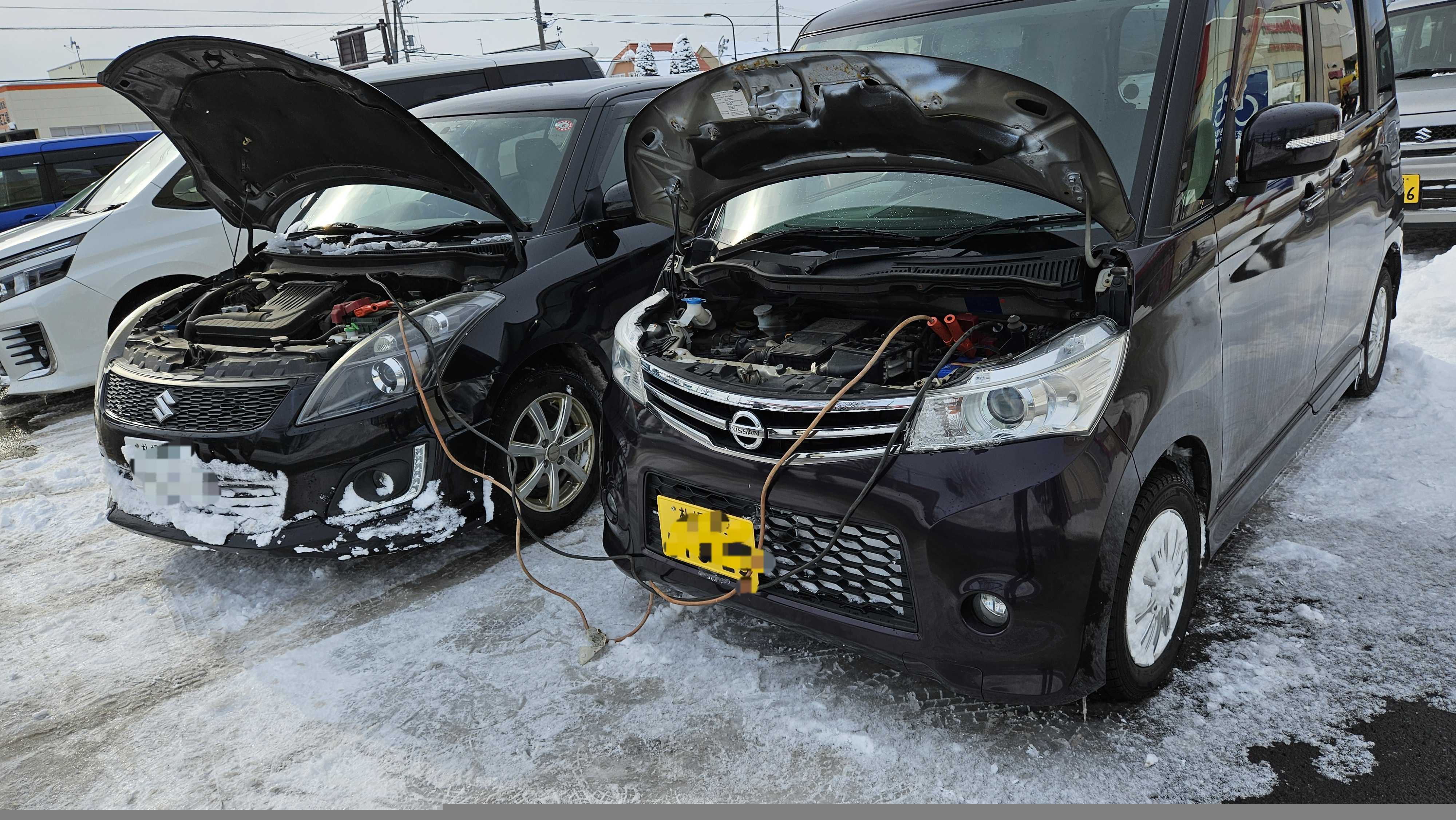 昨日の休憩なし11時間に続き今日は8.5時間の除雪作業(重機オペレーター)が終わる頃に自動車保険のお客さんからSOS買い物に行ったら車が動かなくなったので助けて欲しいとのこと除雪ショベルからSWIFTに乗り換えブースターケーブル持参でレスキューに向かいましたしかしジャンプしてもセルがカチカチ言うだけでエンジンかからずセルモーターか?ルークスはスズキパレットのOEMだし自分のパレットも昨年セルモーター交換してるしなぁ…スマホでリコールサービスキャンペーン情報確認するも対象外その他電気周り調べたら電力不足オルタネーターか…工場に電話したら月曜日じゃないと引き取りできないと言うので保険会社のコールセンターにTEL「保険代理店ですが契約者の車が動かなくなりレッカーとレンタカーの手配願います」今どきは保険にロードサービスとレンタカーサービス付いてますからねレッカー待つ間ブースターケーブル繋いでしばらく充電ロードサービスのスタッフが積み込み場所もないので繋いで置いてくれて助かりました!チャージランプ付いてるからいつ止まるか分からないのですぐ積みます!そりゃぁ素人じゃないし運ぶのはロードサービスの仕事だとしてもスムーズに進めるためのことするよねお客さんは助かったぁと感謝してくれるし帰りの交通費も保険で出るけどわざわざタクシー呼ぶのも面倒なのでスイフトで送りました