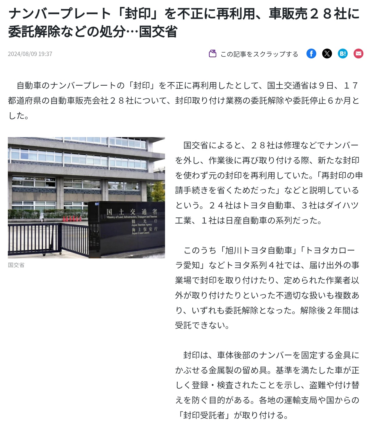 自動車ディーラーによるナンバープレート封印再利用という不正問題この記事を見て「またトヨタの不正か」と思った人も多いのではないかと思いますが自動車業界では当たり前すぎる行為なので見せしめ的な摘発じゃないかと思ってます昭和の封印はテープやハンドグルーなんかでくっつけて引き抜けばスポンと抜けたし枠を壊しても外しやすくて再利用しやすかったこともあり現在は壊れやすくなってますただ封印の台が100円程度で買えるので廃車にする車のナンバーから中央部を傷めないように封印外して再利用するケースも多いみたい修理の板金屋さんなども封印再利用してるところ結構あるんじゃないかな陸運局が近ければ気軽に封印に行けるけど遠かったり混んでいたりで時間掛かると使いまわしちゃえってなるのもわかります1時間あたり1万円前後の整備工賃に換算して封印に手数料1万とか2万とか請求できないし人手不足の整備業界では暗黙の了解になってた気がしますとは言え自動車の盗難やナンバーの不正を防ぐ観点からも不正は駄目ですね自動車にある二輪や軽自動車に封印が無いのは陸運局管轄の登録と軽自動車検査協会管轄の届出の違いです最近軽二輪(250迄の二輪)の届出が軽自動車検査協会から陸運局に移管されましたが登録では無く届出に変わりありません登録自動車は財産扱いなので登録に実印と印鑑証明が必要になりますが届出自動車は認印すら必要ありません都道府県税の登録自動車と市町村税の軽自動車という税制の違いもありますね税金や車庫証明の有利さからも封印もない小さな軽自動車が幅を利かせてますけどこれが770ccにすべきなんて話もありますエンジンの小さな軽なのにそれほど燃費が良くないのはシリンダーあたりの燃焼室が小さいからということもあるんですよ理論的には一気筒辺り4~500ccの燃焼室が効率良いと言われてきましたし小さな排気量の多気筒化でパワーを出すと燃費が悪くなるので排気量増やして燃焼効率と燃費を上げるべきってことなのかな(最近はターボなどにより効率上げてダウンサイジング化されて理論上の効率も変わってきてますか)日本と比べて小さな国の韓国が世界シェアを伸ばしたのは自国で採算採れないから世界基準での車作りに特化したからでしょうねガラパゴスな日本の軽自動車のシェアが伸び続けた結果ホンダはシェア伸ばしながらも赤字になったりしてますし輸出に向かない軽自動車に注力するより世界基準の自動車を進めたほうが燃費も性能も安全性も良いと思うんですけどね軽自動車という規格無くせば新たに生まれるものもあるのでしょうが思考の貧しい日本人には変化が受け入れられないでしょうね軽自動車は後部衝突の安全基準が緩いため米国などに輸出できないんですけどそういう危険度の高い軽自動車を安くもない値段で買ってる日本人が愚かに見えます軽に封印の無い白いナンバー付けてるの見ると黄色いナンバー恥ずかしいと思うなら登録自動車乗れよって思うけど人それぞれの価値観だから別に良いですけどね自分も軽自動車は2台持ってますあまり乗りませんけど…というより乗り物多すぎて乗る機会がないw