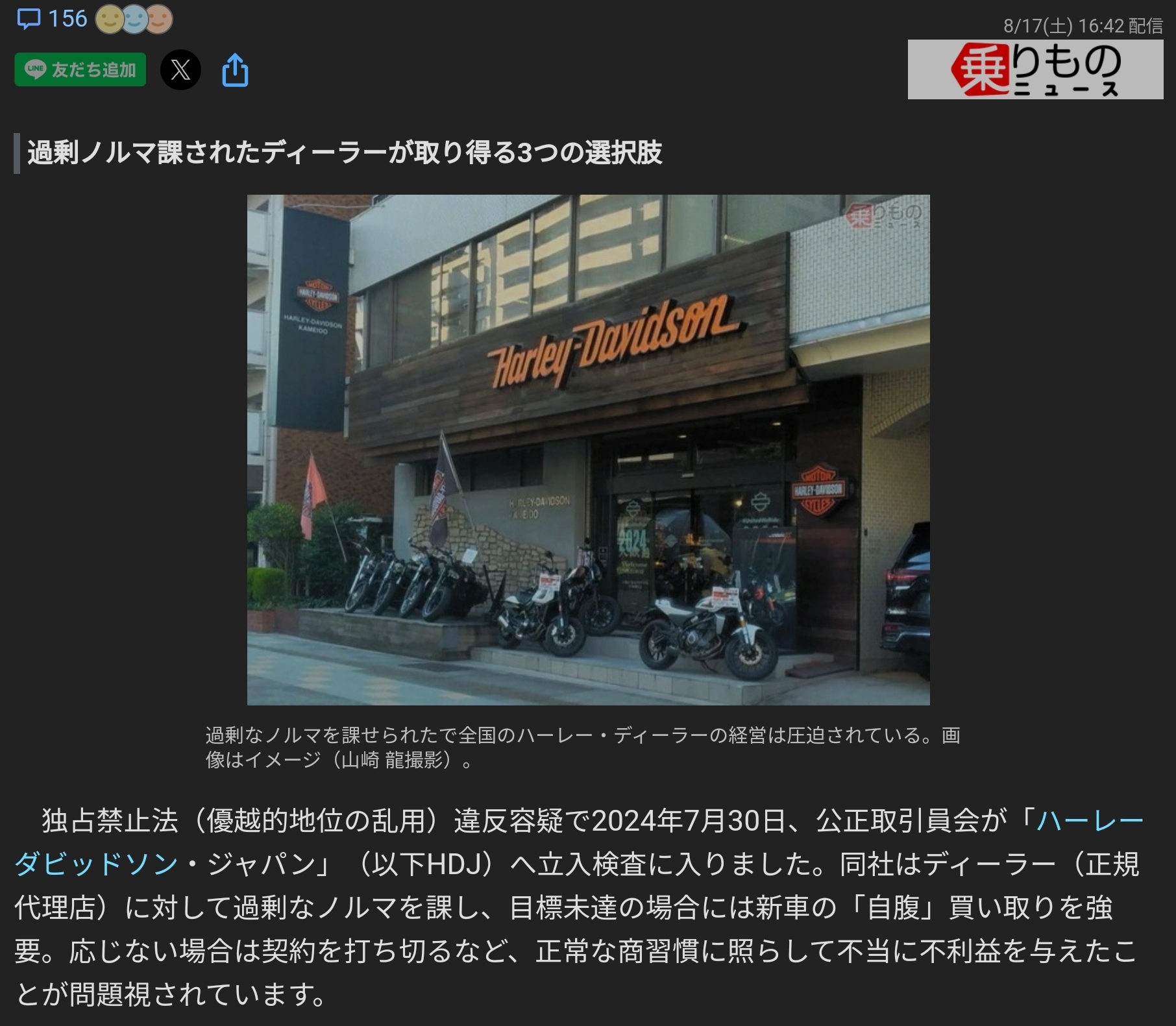 昨日ハーレーのことに少し触れたのでディーラーの販売ノルマなどについて記事は下記リンクhttps://news.yahoo.co.jp/articles/cc68b8eabf6e7bf77cb33da34b3be51aaf8f4b45BMWで問題になった加盟店への販売ノルマでハーレーが公取の立入検査過剰なノルマで前年比130%の登録台数達成したところから昨年はハーレーダビッドソンの120周年だからと更に前年比120%とノルマかけて頼んでもいない機種を強制配車という押し売りしてたというひどい話ここまでやると独禁法に触れるよなスズキの副代理店制度というのが元々2輪も4輪も36台販売が基準でしたその後に小型の副代理店というのがカルタスやエスクードなどの小型車(軽以外)12台販売でした副代理店になると仕入れが安くなるのとバックリベートが出ましたねトラスト店というのがあって120台でした販売店やディーラーが増えたりして36台未達成が増えて24台だったりポイント制にしたりセニアカーも台数に含んだり色々変化もありましたスズキアリーナディーラー制度を作ったときは売れる車があまりなかったこともあり年間120台という基準はあるものの半年で60台を目標にそれが無理なら四半期で30台とか目標にさせて販売未達でも猶予与えて見逃したりしてました当時スズキの小型車を年間120台販売するのは東日本で二店舗だった記憶ありますそんな無理な台数基準を猶予与えて見逃すのも都合よくアリーナディーラー降ろせる為だろうなと当時から思ってました販路を開拓したいことからディーラーの保証金を300万円としながら店舗改装費用としてメーカーから500万円出るので自動車販売会社だけでなくガソリンスタンドや整備工場などからもたくさんスズキアリーナ店ができましたが…販売台数基準の猶予撤廃で副代理店に降格したところが多いですねメーカー直営ディーラーはどんどん立派になるし資本の違いもあるので敵いませんよアリーナディーラーはメーカー直取引だから車が8掛けとか部品が7掛けとかいい話してたけどカタログや販促資材は自腹だし売れ筋の車は利幅少なくて自社登録で試乗車にしたり表向き禁止されてた業販したり大変だったんじゃないかなハーレーダビッドソンの販売ノルマ問題でスズキの人の褌で相撲を取るような販売店契約を思い出したけどスズキの場合は固定された取引条件を販売店が目指して行うから問題にならないわけです軽の登録済み未使用車問題もありますが登録対数のシェア争いがあるのでメーカーも寛容になってるんですけどこれもホントはマズイんですけどねハーレーダビッドソンジャパンはモロに押し売りで公正取引委員会の調査に至りましたスズキの話は地域で販売条件違うことや今とは違う昔話として考慮いただけたらと思います