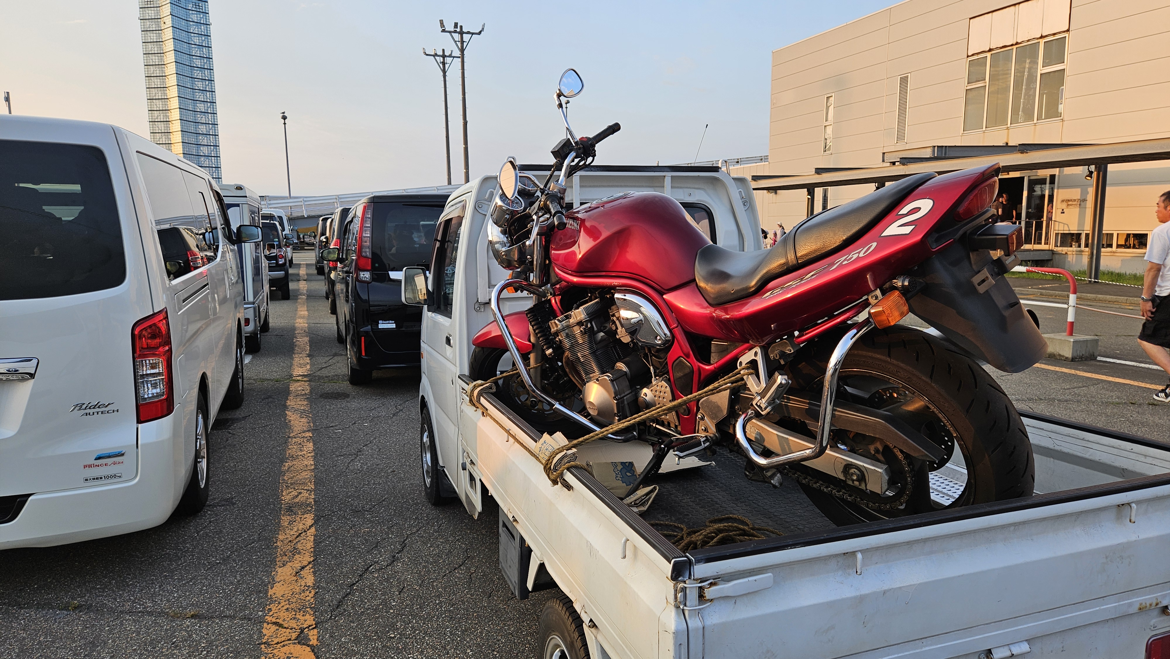 8月1日苫小牧東港から夕方便で軽トラで旅に出る8月2日朝7:35秋田港着能代の親戚の家で少し休んでから大館の秋田北部自動車学校へ教習車GSF750は当時秋田県の運転免許試験場の検定車両だったので大型二輪の指定校認定のために同じ車両を買ってみんなで練習して認定取ったとのことでした公安委員会指定校になることで自動車学校内での卒業検定合格をもって試験場の実技試験免除になります自動二輪(小中限定除く)は昔は一発試験のみで実技試験免除になる免許ではありませんでしたが中型限定が廃止されて大型二輪と普通二輪に免許の区分けが変わってから大型二輪実技試験免除の指定校認定が始まりました確か10人連続一発合格が公安委員会指定校認定条件だったと記憶してます知り合いが自動車学校の10人連続一発試験メンバーになって毎日嫌というほど練習してたのを思い出しますこの教習車両でみんなで頑張って練習して指定校取った車両であることやこのGSF750の現車で夢と希望を持って練習して免許取得した卒業生の思いが詰まった車両だと思うと価値は大きくなりますオートバイは色々持っているけれど沢山の人の思いと共に自分も初心に帰ることができるので購入に至りましたフォークやエンジンからのオイル漏れや伸びたチェーンに凹んだタンクなど色々と手のかかるところはあるけれどそれも含めて楽しみなのでGSFのメンテナンスなどもそのうちブログに記して進めます8月2日は父の命日で亡くなって10年のAnniversaryその記念の日にGSF750を受け取って父の本家のお墓(能代市)にお参りしました父が大切にしていた本家をお参りすることで父も喜んでくれたはず父の姉が92歳で健在なので能代の叔母の家に宿泊させてもらいました8月2日~3日は歩いてすぐのところで能代のお祭り「天空の不夜城」という日本一の高さを誇る巨大な山車のお祭りこの天空の不夜城も10年というAnniversaryなので自分の中では父の慰霊祭のようにも思えます翌8月3日は親父の誕生日従姉妹たちと秋田市で行われる竿燈祭りに行ってきた 長い竹でしなるのが稲の穂を表す江戸時代から続く五穀豊穣祈願のお祭りです保育園から小中高大学校や町内会や企業やサークルや公共団体などなど今年は263本の竿燈が立ちました竿燈の長さは約12mで秋田北部自動車学校の大型教習車両と同じ長さでもあり大型免許取得で感じた長さという尺度で見たのでとにかく凄いという印象でした重量50kgもある竿燈を掛け声と共に頭や肩や腰に乗せてバランスを取るのだから担ぎ手は大変だなと倒れたりぶつかったりするスリルも含めてオートバイと共通するところもあるなそんなお祭りを満喫して8月4日の早朝便に乗りました GSFはバンディットの初期モデルなのでバンディット250とGSF750とバンディット1200改1400のこのシリーズは3台になりましたどうせなら油冷に揃えたいな油冷400のエンジン手に入れて250を400化する工作にも興味あります