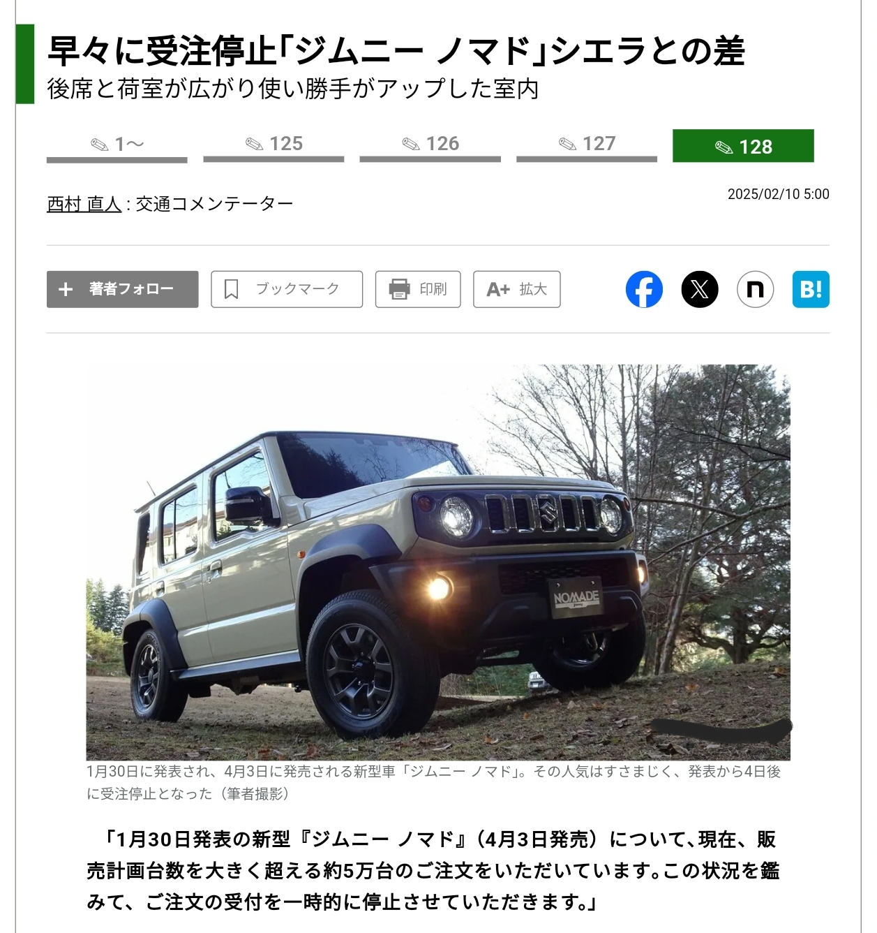 人気爆発なジムニーのロング「ノマド」待ち望んていた人だけでなく品不足になるだろうからと転売ヤーも殺到したんだろうな燃費良くないとか小回り効かなすぎとか弱点がちょっとした話題になってますねジムニーノマドの全長が3890mmと言うほど長くないのに最小回転半径が5.7mか…5人乗りのトレイルブレイザーが全長4870mmで最小回転半径が5.5m7人乗りのトレイルブレイザーが全長5300mmで最小回転半径6.2mと考えると良くないと思うけど…ロングのV8レイルブレイザー乗ってる自分からすると燃費は4キロ台だし最小回転半径6.2mだしジムニー程度で文句言うなら乗らなきゃいいのにと思えてきますw