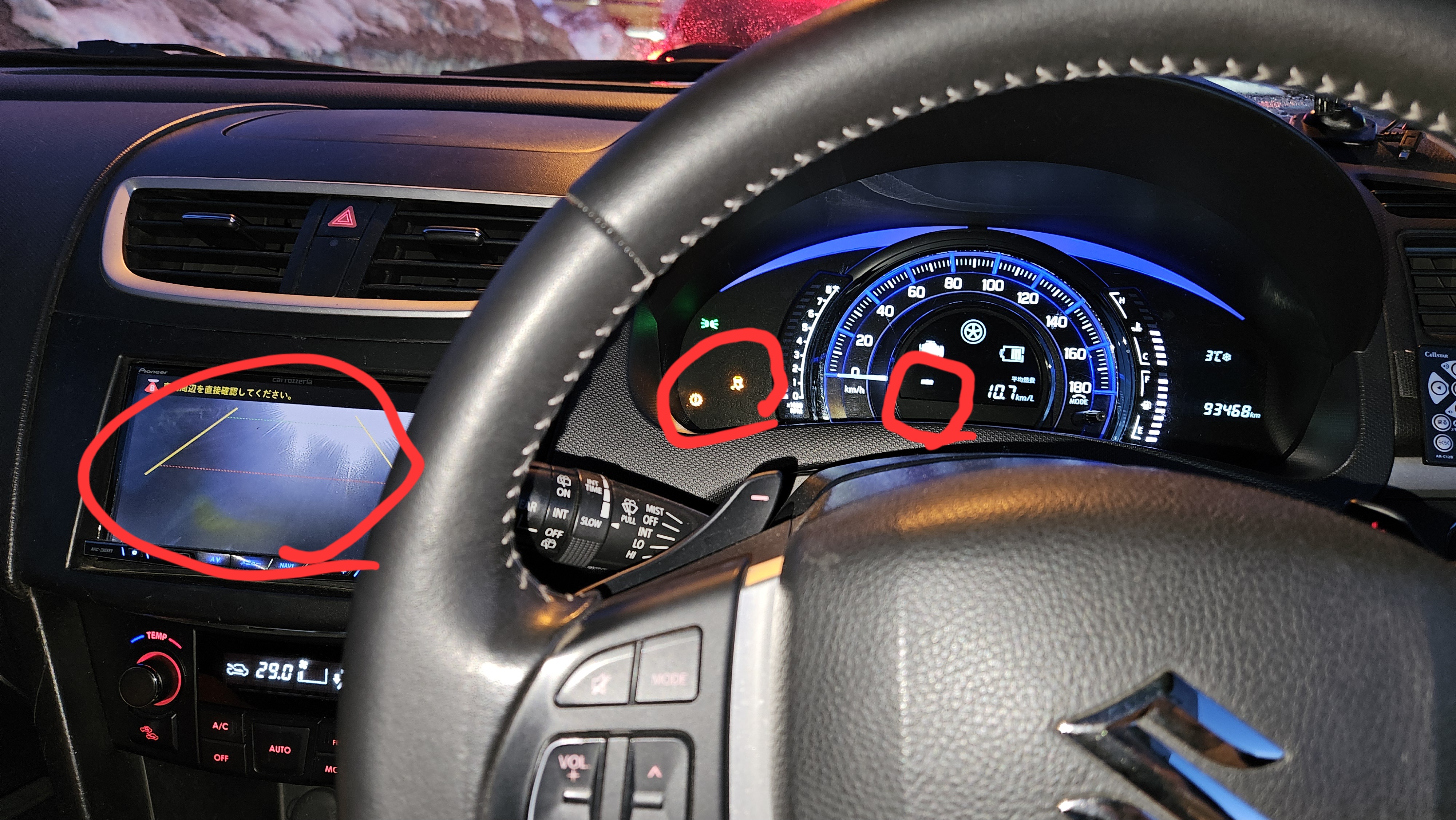 天気もいいし舗装も出てるので今日はスイフトに乗ってました走行中にも関わらず突然ナビにバックモニターが表示されて???信号待ちで止まったらアイドルストップでエンジン停止したんですけどすぐに再始動になりトランスミッション警告灯とESP(ABSとトラクションコントロールと横滑り防止装置などの略)警告灯が点灯信号青で発信したら出だしがやたら遅い左赤丸から走行中もバックモニタートランスミッション警告灯とESP警告灯PRD1のギヤレンジ表示が上部の ‒ だけで文字にならない一度エンジン切って再起動したら直るかも!と次の信号でエンジン切って再始動したのねそしたらなんと…何も変わらないだけでなくシフトがパーキングから抜けない!走れない!そして信号は青になって後続車もイライラ慌ててシフトロック解除ボタン探してボタン押してシフトを動かして発進アクセルベタ踏みなのに中々スピード乗らないしなかなかの緊張感でしたwミッション交換なら新品で4~50万掛かるだろうしリビルト使って半額というところかなもしそうなら買い替えたほうが良いんだけどミッション警告灯だけでは無いので電気的なトラブルのような気もする帰宅後エンジン切って再始動したら…ミッション警告灯は点灯したままだけどギヤレンジは表示されてESP警告灯も消えているしシフトも入る元凶はESPのエラーでそれがトリガーとなっていたのか?とりあえず明日診断機かけてエラーリセットしてこよう