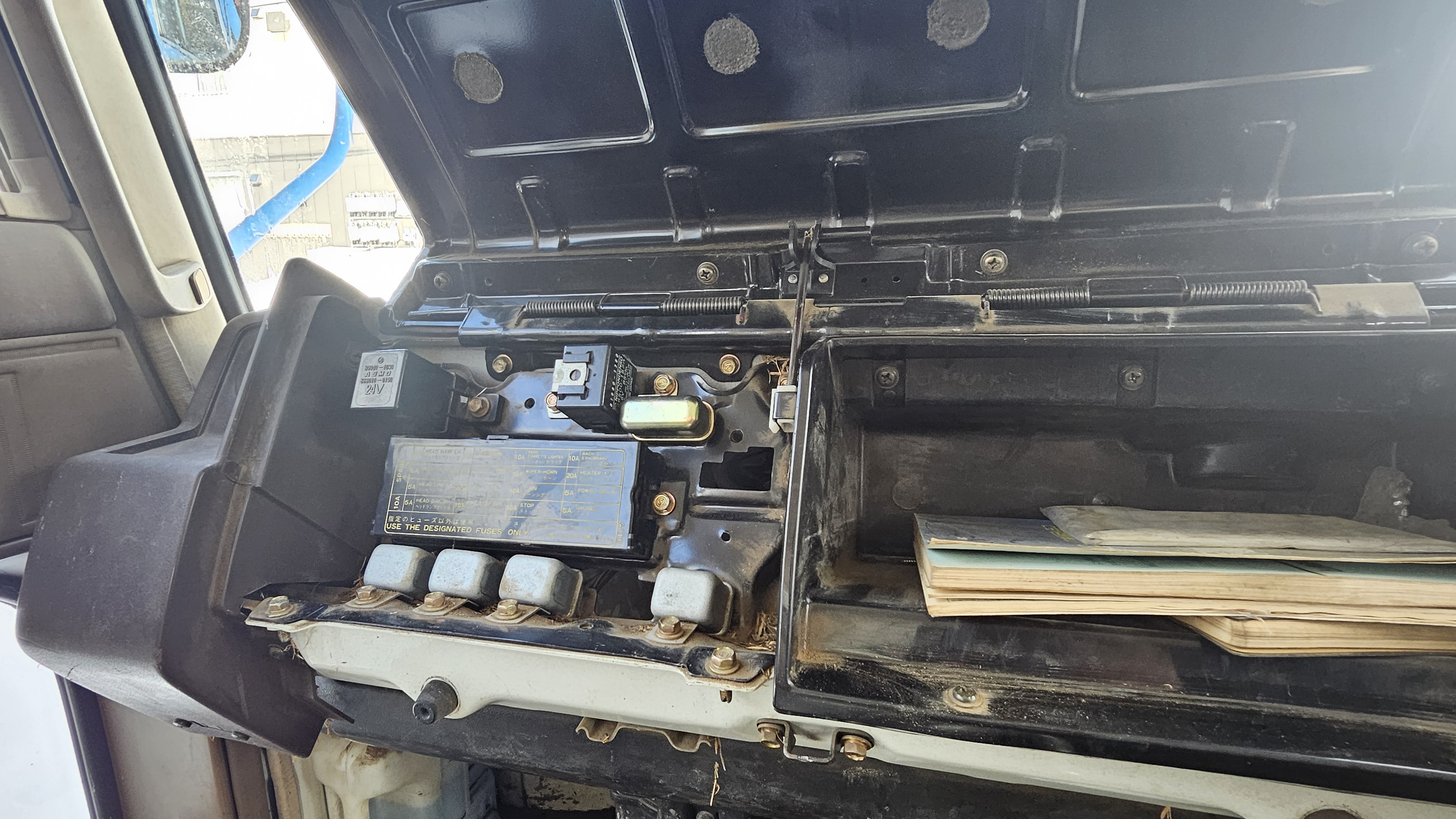 排雪ダンプのウインカーが突然点かなくなったその他の電装は問題ないがハザードにしても反応が無いリレーだなと点検!グローブボックス開けるとヒューズやリレーも出てくるのが雑すぎて今の時代では斬新に感じる接点の接触不良だろうと紙やすり用意してリレー外して分解したら経年劣化のハンダ剥離でしたたっぷり盛ってやったぜ!