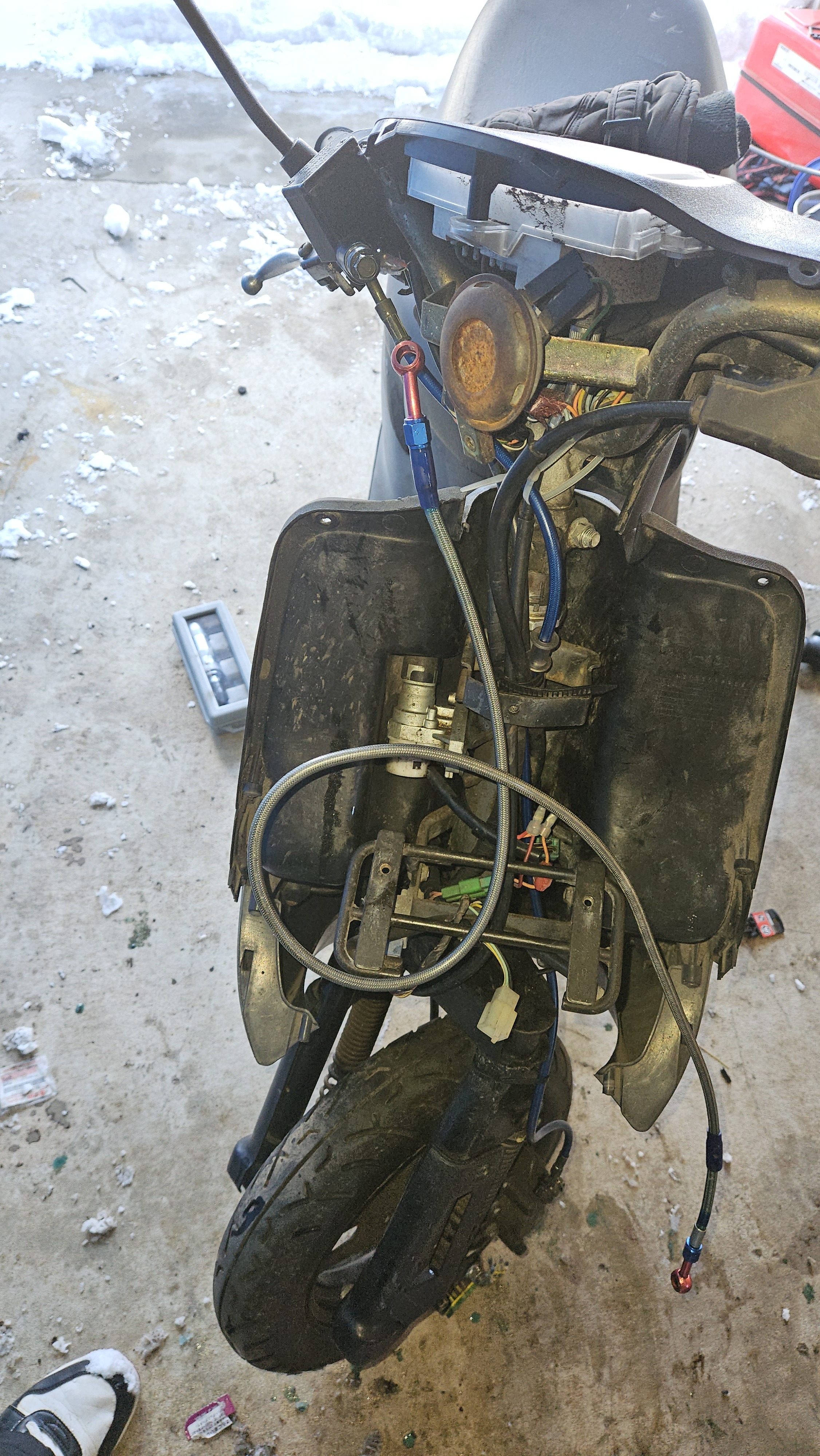 久し振りにスクーターレッツのメンテナンス長いメッシュホースを使ってたのだけどちょうどよい長さのメッシュホースが出てきたので交換したそして雪の上走れるようにタイラップのチェーンを巻いてみた空気圧低めにしておいて巻いてから空気入れないとタイラップバンドチェーンがズレるんです余計な部分はハサミでカットしましたボトム式リンク&ディスクブレーキに謎のタイラップチェーンで走るの楽しみだ!しかし現実は甘くなかった1キロも走らないうちに前後からバキバキ音が鳴り出して切れて車体に当たってる?!2キロも走ったら音がしなくなり振動もフロントにカタンカタンと感じるのみヤバイなほとんど無くなったのか?不安になり交通量の多いバス通りから裏道に入った裏道の圧雪アイスバーンでいきなりスピンチェーンもなくこんなタイヤで走ったらそりゃ危ないわこのタイヤで走った感想としては「スタッドレス履いたら普通に走れそう」来年はスタッドレスで遊ぼうと思う