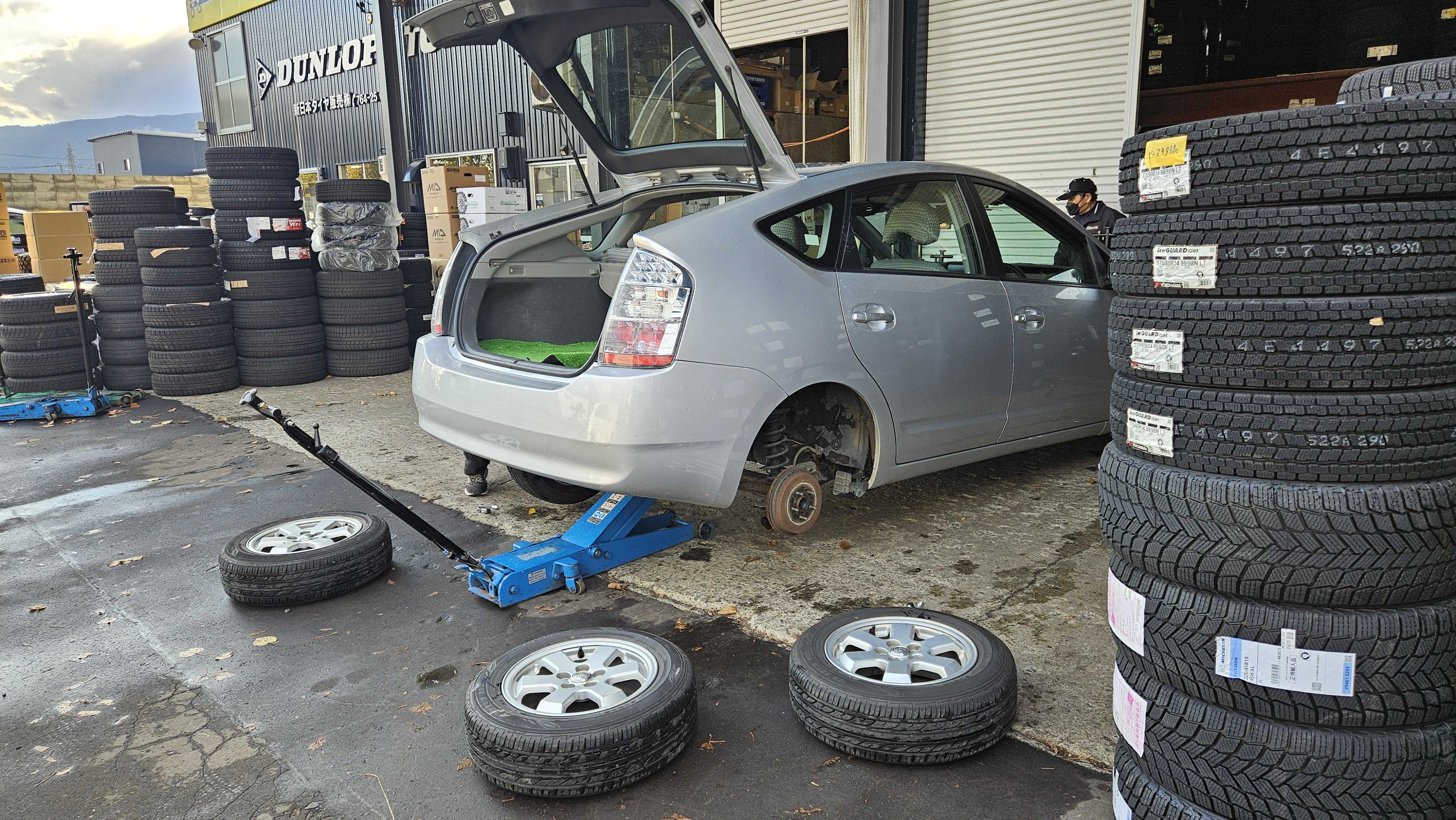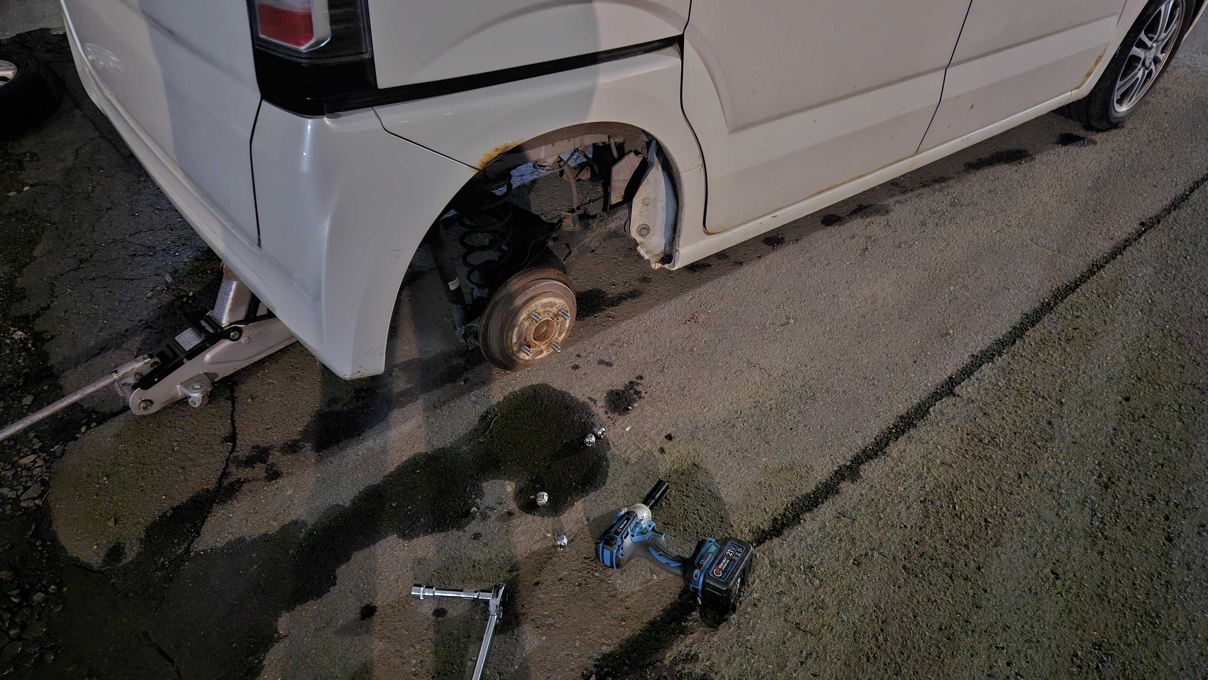 昭和の昔は車に乗るということはトラブルは自分で対処しなければならなかったから車載工具も必ずあったけど今はスペアタイヤも積載されない時代なので自分で交換するという発想すらない人もいるユーザー自身で交換してタイヤ脱輪という事例も度々あるから任せたほうが良いのだけれど「サービスステーション」と言われたガソリンスタンドもセルフが多くなってピット作業激減整備工場は整備士不足だしタイヤ屋さんも含めてどこも混雑昔は自分で交換していた人も高齢化や夫に先立たれてなどの事情から自分に頼んでくる人結構居ますこの時期は油圧ジャッキと電動インパクトとトルクレンチと電動空気入れをN-BOXに積んで出張交換がよくありますトレイルブレイザーで回ってたこともあったけど荷台が高いのと車がデカいのでN-BOXが便利です後席のシートを跳ね上げて低床の荷室を利用してスライドドアから油圧ジャッキを出し入れするのは楽です大した利益にはならないけれど頼られて信頼を得られるメリットの方が大きいかな 自分のN-BOXもタイヤ交換しなきゃなと暗くなってから作業ドアやフェンダーは錆びやすい車だけど中はそれほど錆びてないです交換終えて走ると冬タイヤのふわふわ感純正の14インチから13インチにインチダウンしていてタイヤの厚みが増してるから当然なんだけどすぐ慣れます雪道は凸凹も多いし扁平タイヤよりもインチダウンの方が乗り心地よいですからね
