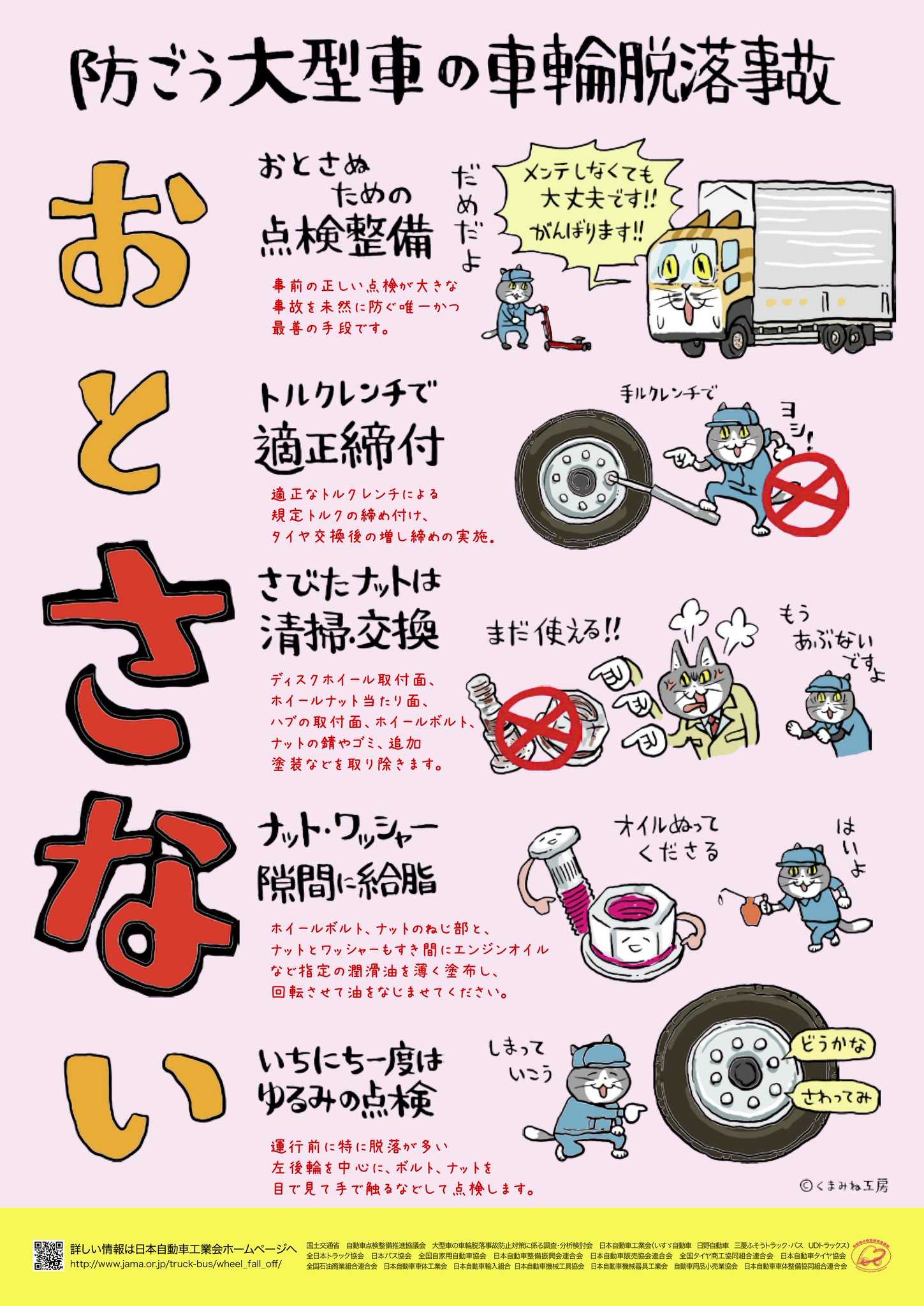 昨日10月9日はトラックの日と言うことでトラックネタ自工会が仕事猫使うのがwwwこの啓蒙ポスター中でホイールボルトナットのネジ部にエンジンオイル給油というのがありますがトラックと乗用車の違いを知らない人も多いと思いますオイルを塗布すると当然摩擦係数が減るのですが締付は強くなります締結力と言いますがこれをAIで説明すると以下の通り締結力(たいせつりょく)とは、ねじやボルトなどを用いて部材を締め付けた際に、部材同士を互いに押し付ける力のことです。この力は軸力とも呼ばれ、ボルトがバネのように伸びて元に戻ろうとする力(弾性エネルギー)によって発生します。締結力は、製品の信頼性を維持し、部材の滑りや破損を防ぐために重要ですが、過度な締結力はねじや部材の破損につながるため、適切な管理が必要です。ホイールはネジの摩擦で止めているのではなく締結力で止まっていますからオイル塗布が必要なのですしかしこれはトラックの話なので乗用車のホイールボルトナットにオイル塗布はNGです乗用車のボルトは細くて強度不足締結力が強くなり過ぎて伸びたり破断することを防ぐためオイルは塗りませんオイルでネジの摩擦が低くなると同じトルクでも締結力は強くなるということです北海道ではこれからタイヤ交換の季節になりますのでオイルは塗らずに交換しましょうトラックの脱落事故が度々話題になりますが大抵左後輪の脱落ですその為トラックの左側はJIS規格で逆ネジになっていてタイヤの回転方向で締まるようになっていましたが国際規格にあわせて2010年から正ネジになりましたそれで脱落事故が増えました日本は左側通行なので左折の曲がり角がきついため左側にストレスが掛かるんですよね大型貨物などはリヤ8輪だしねちなみに昔の三菱の脱輪事故はハブの強度不足での破断が原因でしたそれを隠蔽してユーザーの管理不足にしていたんですからどんだけクソなのよwww昭和の古い車は左側逆ネジでしたねちなみに自分のJ58ジープも左側逆ネジです幌も買ったし来年は車検取りたいな