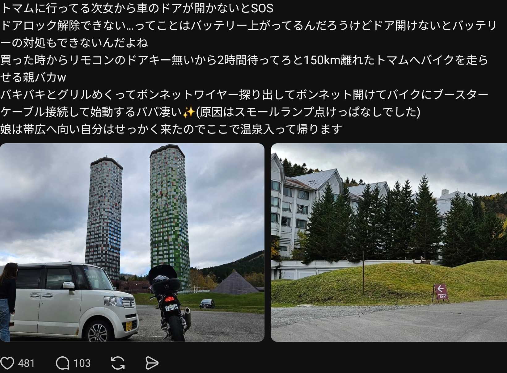 リモコンのボタン押してリモコンは光るけどドアが開かないと次女からSOSの電話あ~やっちまったか!あのN-BOXは自分がUSSオートオークションで落札したけどエマージェンシーキー(リモコンに刺してある解錠の鍵)のないリモコン2個ついてきて鍵がなかった車なのでバッテリー上がったらアウトなんだよぉバッテリー繋ぐにもドア開けないとボンネット開けられないからね自分はJAF入ってるからよいけど娘は対象外(自動車保険のロードサービスも要名義人本人確認)2時間待ってろ!と初のトマムツーリング決定バンディットに工具積んで紅葉のトマムへ!鍵壊すのも面倒なので少々乱暴にグリルめくってドライバーでボンネットワイヤー引っ掛けてボンネット開けたブースターケーブルでバッテリー繋いだらセキリュティでホーンが鳴るのでリモコンキーで止めるドアロック解錠してスタートボタンでエンジン始動!一般的にはバイクの小さなバッテリーでエンジン掛かるのか?と思うだろうけど660の軽でしょ?俺のバンディットは1400だからねwwwパパ凄い!そして娘の友達もお父さん凄い!ハッハッハこんなもん楽勝よ!と言いつつ実は毎週の空手のダメージ蓄積してて首と肩が辛くて今朝は厚田への朝ツーもやめてたのになwww更に昨日孫を高い高いし続けて喜ばせたツケが首と肩に重くのしかかってましたそんなこともあり温泉道具持参で来たんだけど娘の友達が良いタイミングで「温泉入っていってください」とチケットくれましたバッテリーは時々専用テスターでCCA値もチェックしてるから少し走るだけで復活するのでOKだけど念の為ブースターケーブル積んで娘を送り出す娘は友達と帯広へ向い自分は温泉へそこらじゅうで鹿が居るのも興味深い施設に入ると家族連れで賑わっていて楽しそうな中国語が飛び交うwこんな破綻したリゾートなんてインバウンドなければ成り立たないのだから外国のお客さんに感謝すべきですねそれにしても日本人も含め子供たちにはいい思い出になるだろうな自分も今は無き「茨戸ハワイランド」の思い出あるもんなプールの奥の温泉の露天にゆっくり浸かって温まり…帰りは雨www雨予報ではなかったのに少し湿って帰りはヒンヤリから冷え冷え普通に湯冷めするよな郊外では油温40度に満たないしかじかんだ手でエンジン触りながら走りました左手は良いけど右手はアクセルだから温めるの大変なんだよね左手でアクセル押さえながら右手でエンジン触って温めるのはなかなか難しいんだけどそんなことしながら帰ってきましたN-BOXバッテリー上がりのレスキューをたまたまThreadsに投稿したら否定コメント溢れてwwwエマージェンシーキー知らないのか?保険会社のロードサービス知らないのか?エンジン掛けただけで送り出したのか?等々沢山頂きました誰に物言ってんのよ?!と思いつつ考え至らない人達相手しても仕方ないんだけどね要は臨機応変に最善策を導き出すのが大切でそれを実践しただけ費用対効果とメリットデメリットなど総合的に考えて自分のできることしただけなのでできない人には思い描けないだけのことなのです今季最後のツーリング兼ねて娘からの信頼も得られて思い出になるもなる良い一日でした