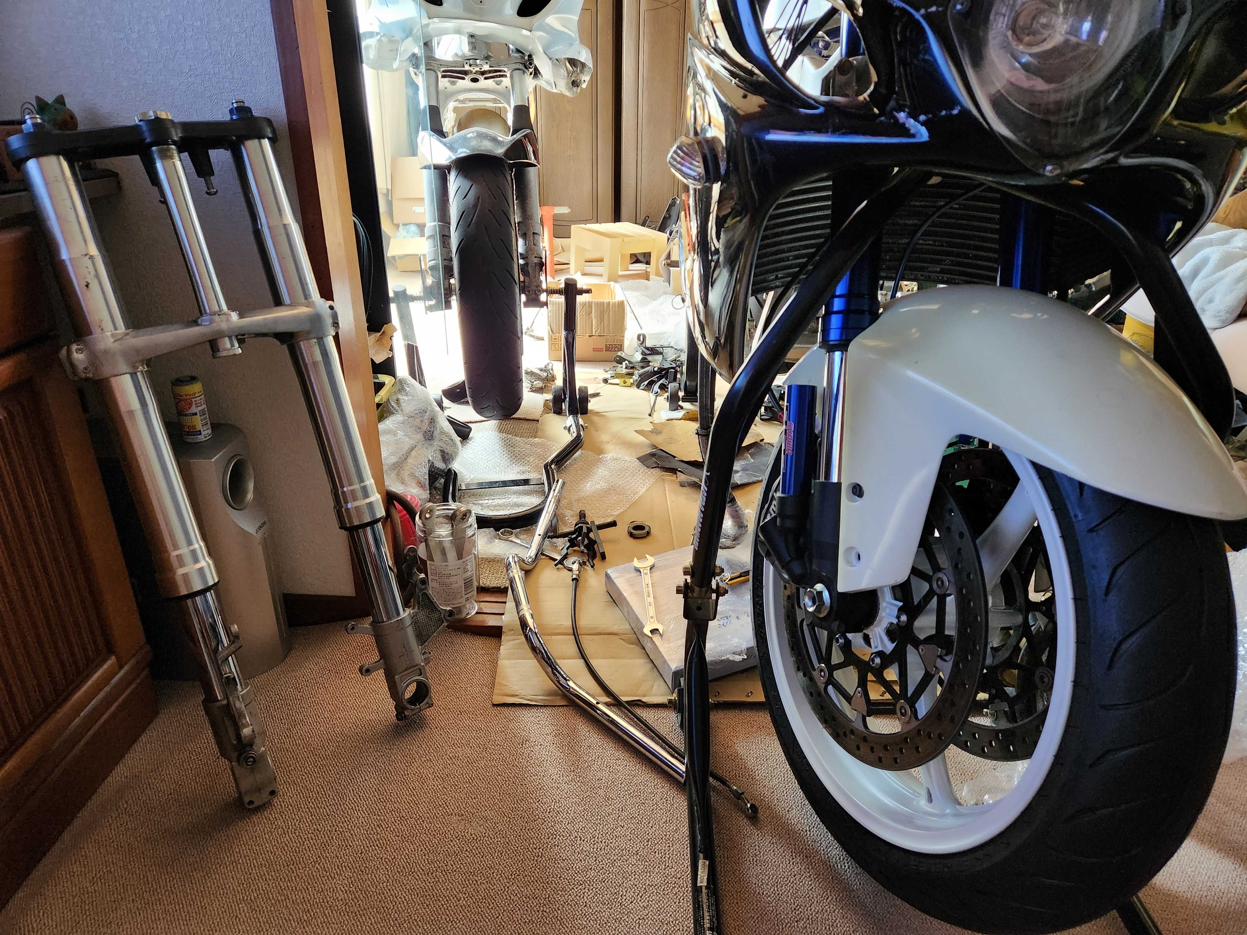 因みにこのフロントフォークはGSXR1000K1ヨシムラマシンのものなのでこのまま使ってGSXR1000RのBFFフォークは2号車に