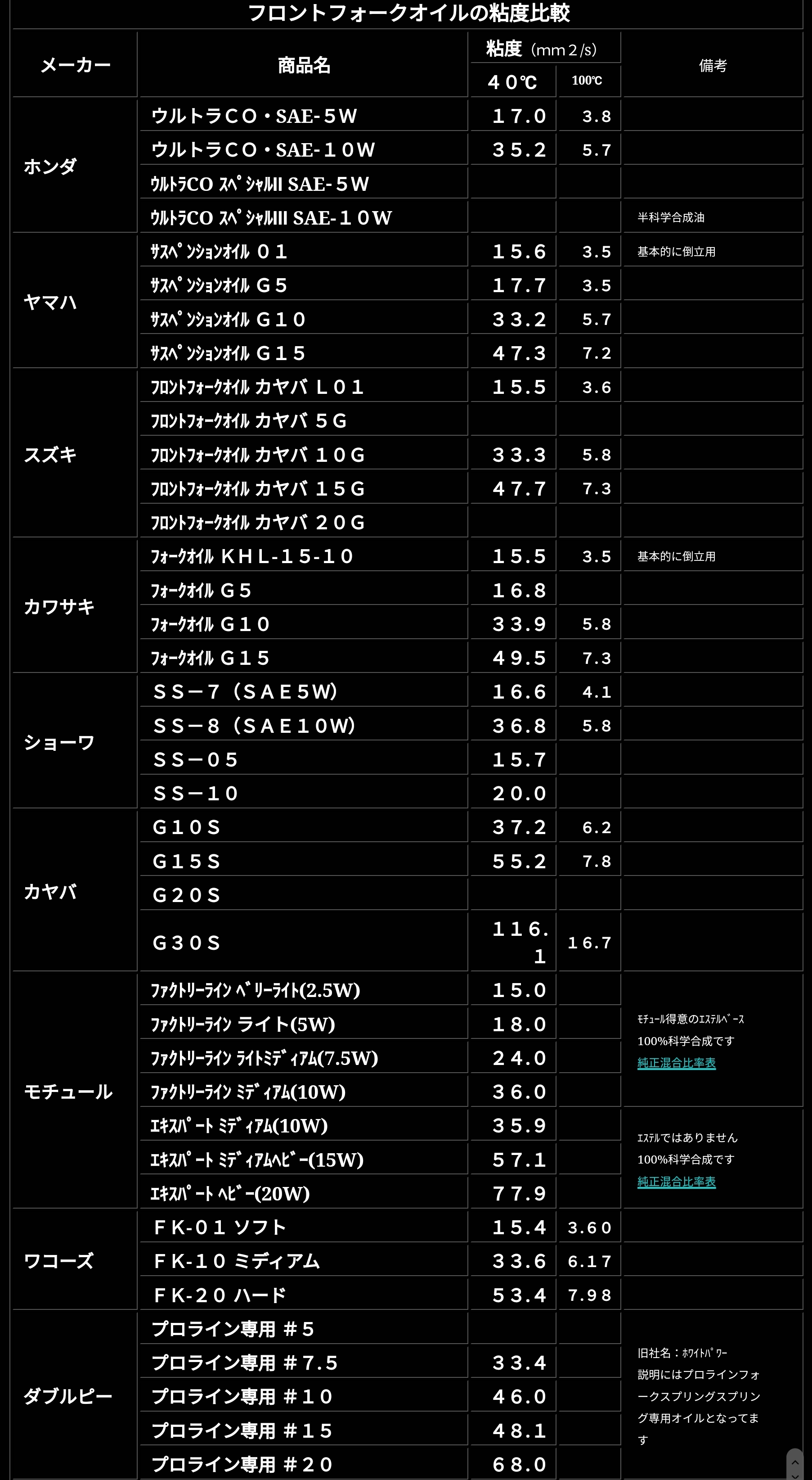 ネットで検索してみると油面が92mmと105mmなのとオイルがスズキフォークオイルL01とかG15というのがいくつかありました