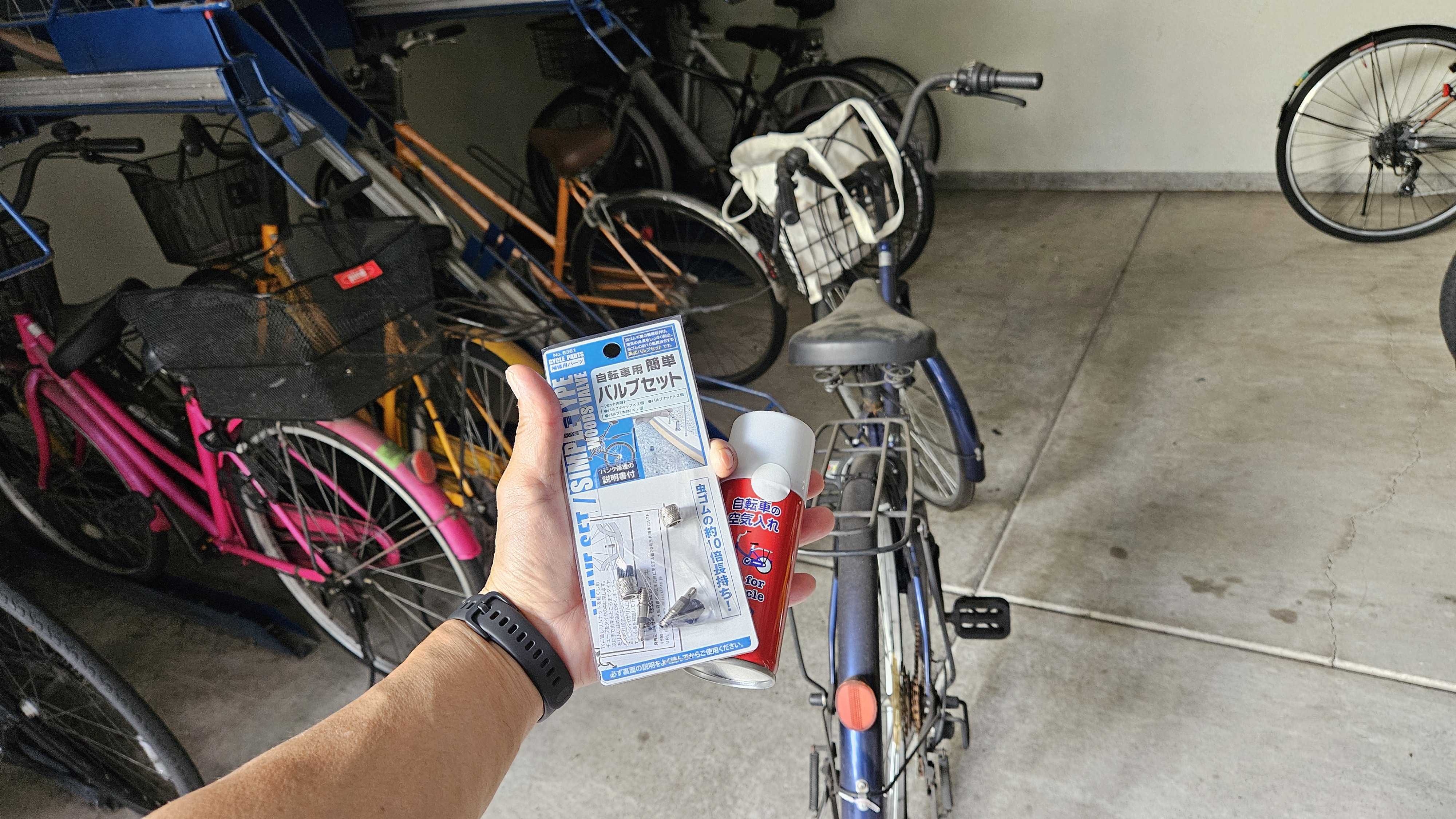 マンション駐輪場の上段から自転車を降ろしてバルブ交換とエア注入