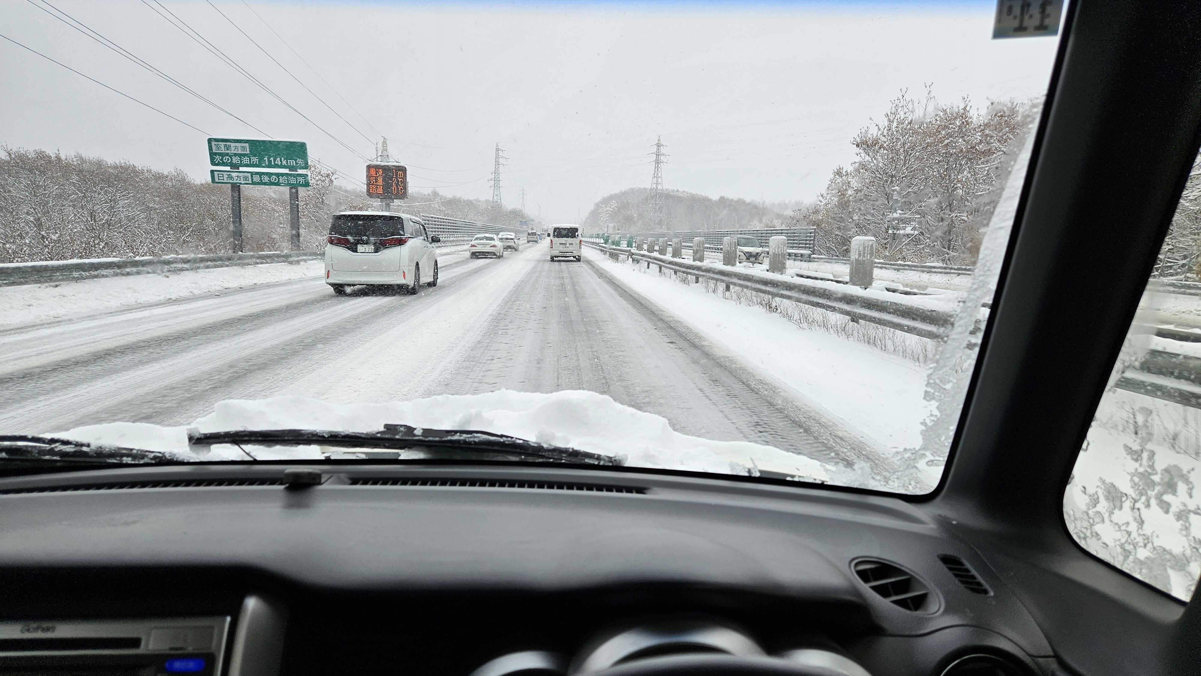 高速道路は圧雪アイスバーンで50キロ規制で除雪車も出動してました
