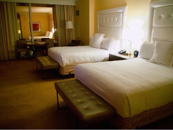 こんにちは。吉村シスターです。今年の2月にラスベガスへ旅行した際に、2つのホテルに泊まりました。1つ目は米大統領でお馴染みのトランプホテル▼トランプホテル滞在記▼https://plaza.rakuten.co.jp/yoshimurasister/diary/201810270000/2つ目は、ラスベガスの定番ホテル、”ベラージオ”です。よくラスベガスの写真などで見かける噴水ショーのあるホテルです。今回は奮発して泊まってみました!▲こちらがロビーの写真です。天井の装飾がとてもきれい。。。日本にはないような世界観です。写真の奥の方にはカジノが見えます。ラスベガスにはカジノがあるホテルが多く、規模もかなり大きいです。ベラージオは街の中心にあり、定番ホテルなのでとても賑わっています!▲ロビーのレセプションの奥には旧正月の装飾が。(撮影時は2018年2月中旬です。)レセプションの数も普通のホテルよりかなり多く、スタッフの方々をよく見るとみんなそれぞれ、自分の国のバッチをつけています。とても多国籍。私がチェックインしたときは、美人なナイジェリア人女子でした。とても親切な方で、どうも私たちの部屋の階を上げようとしてくれるらしく、でも今は時間が早いのでまだ部屋に入れないみたいで。。。それを説明するのにわざわざ翻訳サイトで日本語に訳して紙に印刷してくれましたwその親切さに感動しました。受付がこのお方でよかった。。▲いよいよ入室!ツインルームです。受付の方の親切より、最初下の方の階でしたが24階になりました。(ベラージオは36階建てのようです。)▲部屋からの眺めです。これぞラスベガスって感じの風景。。噴水側の部屋を予約しておいてよかったと思いました。ファウンテンビューのお部屋の方が少々お値段が高いのですが、泊まる価値は十分にあります。夜になると・・・▲部屋からの眺め、夜バージョンです。噴水ショーは昼から夜まで15~30分間隔であります。ベラージオ限定だと思うのですが、テレビをつけると噴水ショー専用のチャンネルがあり、そこからも音楽が流れ、曲名が表示されています。なんかもうずっと見とれてしまう感じです。。▲バスルームです。洗面台、お風呂もとてもきれいでした。こんなところにツボとか置いていいのかと思いますwトランプホテル同様、浴槽とシャワールームがちょっと離してあるタイプ?でした。写真とは反対側にシャワーがあります。ラスベガスのホテルはどこも部屋数が多いため、また、カジノで儲けていることもあるので、5つ星ホテルでもそこまで高くないです。ベラージオも約3900室あり、立派なカジノを持っています。シーズンにもよりますが、リゾート税など含めて1泊3万円くらいで泊まれました。5つ星なら安いほうですよね。。普段は泊まらない値段ですけど。ホテルが豪華だと旅の質があがりますね。さあ眠らない街、ラスベガスを楽しむぞ!ベラージオホテル公式HP