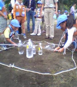 沢山のスカウトが集まって地区ラリーを楽しみました多くのスカウト達が山下公園を闊歩しましたが、一般の観光客が沢山居る中での開催でしたので右往左往してしまい、全部のポイントは廻り切りませんでした。↑協力してアラブの油(水)を持ち上げろ↑日時計、今何時?北は何処だ?ただ、ポイントでの遊びやプログラムは楽しかったな~