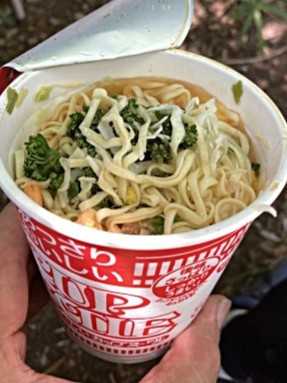 撤営日の昼食を冷カップヌードルにした水戻しで20~30分放置水戻しのお陰なのか結構いける余った食材(パセリやカットキャベツ)を入れたら味変で更に良かった