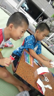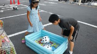 8月20日(土)今日は地蔵盆 ・・・ 朝からかなり浮かれ気味、、、ハードは1日になりそうな感じ。。。まずは10時にお菓子とジュースをもらい、そのまま手芸&工作に取り組みます!長男はさすが! おじさんに聞きながらさっさと作ってます!二男&三男は?「どうすんの~? あ、こうか! あれ~できひん ・・・ どうすんの~?」ずーっとくりかえし聞こえてきます、、、係のおじさん、、、ごめんなさい。。。長女は手芸、、、友達&友達のお母さんとがんばって作ってます!あそこはおまかせしておこう。。。 「ママ、、見て~」あ、やっぱり呼ばれた。。。バタバタしてて写真が取れなかったので後日にゆっくりみせてもらいました。。。お! なかなかの出来です! かわいいので玄関にかざりました。。。これを夏休みの宿題として提出する子もいます! それもありよね~。。。その後はしばらく自由時間、、、そこらじゅうから風船の割れる音が !!!どうやらいろんな風船を勝手に膨らませてもらってかえっても良いようです!気がつけば、、、二男&三男も風船をもってあそんでます。。。長女もなにやら物色中、、、人ごみにまぎれて空気入れをゲットして膨らませてます。。。長男は、、、泣いてます。。。 長男は風船の割れる音が大の苦手、、、大泣きです!「もう、昼休憩になるしパパと先に帰っとき!」 「嫌や! 遊びたい~」いやいや、、、その顔では遊べないでしょ。。。 みんなビックリしてるやん!結局パパ&四男とお昼ご飯を買いにいきました。。。昼休憩後は [ 宝探し ] です! 今年は全員見つけられるかな?1時になったのではじまります!「よーい、スタート !!!」しばらくほっておいたのですが、、、見つけられない様子、、、近づいてきた子達にヒントをだします! ・・・ なんとか全員ゲット !!!なにもらったの? 長男は [ ヨーグルトマグカップ ] 、、、よくわからん。。。二男は [ かわいいシール ] 、、、「マユちゃんにあげるー」長女は [ しゃぼん玉 ] 、、、もう出して遊んでます。。。三男は? [ うさぎのノート ] 、、、これも長女行きになりそう。。。その後はゲーム&くじ引き大会。。。 ワンピースのくじに行列が、、、長男もちゃっかり混じってます!、、、後の子は?ポケモンのくじがしたい様子、、、うちの子以外は2人しかならんでないけど。。。どうやら人手が足りなくてポケモンくじが出来ない感じ、、、「誰か手伝って~」っという声が !!! う~ん赤ちゃん抱いてるけどできるかな?なんとかポケモンくじの相手をしていると、、、3人ほど駆けつけてくれ交代。。。テントに寝かしてた四男はおばあさま方がガードしてくれてました。。。かなりの数のくじを引いたのに、、、うちの子たちは [ はずれ ] ばっかり、、、そんなに [ スーパーボール ] ためてどうするん。。。でも、みんな満足そうです!長女はここでピアノのレッスンに行きます。。。 すぐに帰ってくるしー !!!他の子たちは [ スーパーボールすくい ] です! ・・・ 今いっぱいもらったけど。。。長男は友達とはしゃぎながら頑張ってます!、、、5年生は仲良し。。。二男&三男は、、、言われるまま挑戦、、、すぐに終わっちゃた! こんなもんでしょ!3個ずつもらってごきげんです。。。 もうだして遊んでます!長男がやって来ました! 「壮ちゃん の分やらしてー」、、、どうぞ。。。また5年生達ははしゃいでます! 、、、 ほんと仲良し。。。結局、長女の分もやって大満足! ・・・ 良かったね!次はお待ちかねの [ 福引 ] ・・・ みんな大興奮 !!! 良いの当たるかな?まずは四男、、、長男&長女がつきそって引かせます、、、[ 積み木 ] でした。次は三男、、、お! [ エアーサッカー ] ・・・ 5年生達に奪われました。。。次は二男、、、[ 巨大水鉄砲と恐竜 ] ・・・ 水鉄砲ほったらかしで恐竜に夢中。。。やっと長女、、、 [ ネイルアートキット ] ・・・ やって良い?、、、休日にね!長男は??? 、、、 5年生以上は全員図書カード ・・・ え~、みんな一緒~他の子が残念がってる中、長男は一人興奮中、、「、ワンピース買えるー」 良かったね!5年生達は遊ぶものがないので、四男のエアーサッカーに数人群がってます!四男も混ぜてもらってごきげんです! ・・・ みんな好みの品が当たった様子。。。夕食休憩に帰る道中も浮かれ気味、、、ちゃんと前見て歩いてねー。。。他に [ お参り ] や [ 和太鼓の演奏 ] があり、、、最後はビンゴ大会 !!!どしゃぶりの中なんとかはじまりました! [ ワンピース文具セット ] が二つと~ [ 光るヨーヨー ? ] [ 石鹸にハンカチ ]あと、なんだっけ??? ・・・ ま、いろいろもらって終了~ !!!今年もみんな楽しかった様子。。。 地蔵盆はと~っても楽しいです!帰ってお風呂に入り、、、チョット休憩。。。気がつけば四男が爆睡、、、い~っぱい御愛想してたもんね~。。。 おつかれ~その後、夜泣きもなく朝まで熟睡。。。 壮ちゃんも楽しかったみたい。。。来年はもーっと楽しめるね! あるいてるかな???