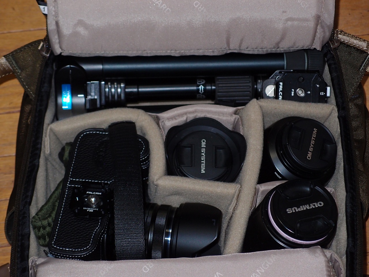 先日、長らく使わないままになっていた35mmフィルムカメラ時代に使っていたカメラザックや昔ながらのアルミバッグを処分しました。で OM-1 の為に新たに購入したカメラザックがタイトルの VANGUARD VEO GO 46M KG です。VEO GO 46M KG | リュック | バンガード(VANGUARD) 公式サイト – VANGUARDオフィシャルサイト近所(大井町)のヤマダ電機で在庫処分で安売りしていた最後の1個を店頭で確認し、一度自宅に戻ってネットの評価も確認し、翌日、再度店頭に出向いて購入しました。因みに VANGUARD(バンガード)は1986年に設立された日本のメーカーで、中国とミャンマーに生産拠点を持ち、カメラバッグ、三脚、双眼鏡等の光学製品を販売しています。個人的なブランドイメージは Lowpro やハクバの下って感じで、出始めの頃は「安物感」が製品に滲み出ていたように思いますが、本製品はなかなかどうして、しっかりした作りです。本音を言えば、今どき流行りの「サイドオープン型」のザックが欲しかったのですけど、いかにもカメラザックですと言う厚みが、見た目的にもスペース的にも納得できないでいました。マイクロフォーサーズの場合、OMDSの一番大きなカメラである OM-1 でさえ、ザックの厚みがとても無駄に感じられたのです。まぁ、縦位置グリップが付いたカメラボディが収まるように作られていればその厚みが無駄に感じられるのは当然の事ですね。そんな時、偶然発見したこのザックはメーカーHPの画像でも解るようにミラーレスカメラ専用とされ、一般的なザックと変わらない程に厚みが薄く造られていました。だと言うのにカメラザックとしてのクッション性がしっかりと確保されていて、かつ納得できる収納力も持っている事に好感を持ちました。この時点で「サイドオープン型」ではない事だけを残念に思っていました。このカメラザックは、前面にある「タブレットポケット」のサイズが「9.7インチ」になっている事からも、実はある程度は古い製品だと想像できます。だからこそ今時の無駄に大きなフルサイズミラーレス機は想定されていないのでしょうし「普段使いのザック風」なデザインを採用していながら、しっかりとレインカバーまで付属する、見た目はカジュアルザックなのにその実態は正統派の「カメラザック」に仕上がっている意外性がなんとも楽しくて「サイドオープン型」では無い事に、心残りはありましたが、安かったし、最後の1個だったので、購入する事にしたのです。と言う事で無事自宅に持ち帰り、実際に機材を入れて色々と試してみました。三脚、ボディ+レンズ、レンズx3本が背面からアクセスする下部に収まります。OM-1 & M.ZD12-45/4.0 Pro、M.ZD 9-18/4.0-5.6、ZD 50/2.0 Macro、ZD40-150/4.0-5.6、が収まっています。フォーサーズレンズにはそれぞれ MMF-2 と中華製アダプタ付。手持ち三脚の Velbon UT-43 が収まったのが個人的には嬉しいです。三脚の代わりに大きなレンズを入れる事も可能で、カメラ収納部の収納力に不足はありません。サイドオープンではないからこそ両サイドにポケットがあるので、三脚をサイドポケットに入れても、ペットボトルや水筒を、余ったサイドポケットに収納できます。三脚をサイドポケットに入れた場合、そのスペースには三脚座を外したM.ZD ED 300 / 4.0 IS PRO も余裕で収まるので「野鳥撮影」にも使えます。OM-1 で三脚を使うシーンは、夜景(ライブコンポジット)マクロ(深度合成)風景(ハイレゾ)で、今やプロキャプチャーを中心とした「野鳥撮影」は手持ち撮影が常識ですかね。外観こそ街中で使用する普段使いのザック風ですが、マイクロフォーサーズで運用する場合、多用途に使える収納力があります。なお、上記画像でボディを「逆さ」に入れているのには訳があります。ザック上部(画面右側)は二気室に分けるパーテーションで仕切られています。一応、内部のパーテーションを全部外すと1気室のデイバッグになるので、内部の自由度はかなり高いです。デザインがカジュアル過ぎますが、フルオープンせずとも出し入れ可能なノートPCの収納スペースが有るので、1気室や2気室のビジネスザックとしても運用可能です。先に書いたように、三脚をサイドポケットに移せば、更にレンズや小物を入れる事が可能ですが、昔ながらの背面フルオープンスタイル故に速写性は皆無で、そういう意味での使い勝手は、決して良くありません。というかカメラザックとしての使い勝手は、良くも悪くも正に昔ながらのカメラザックそのままです。ですが、カメラの入れ方を工夫して、何とかサイドオープン風に使う事に成功しました。もちろん、本家のサイドオープン式のように「スルスル」と出し入れは出来ませんけど OM-1 でもワンショルダーにして背面ファスナーの片側を開けて、ボディの出し入れが出来ました。OM-5 の様なコンパクトなボディなら、もっと楽に出し入れできると思うので、もう「サイドオープン」に拘る必要はないかもしれません。サイズ的に 12-45 / 4.0 Pro の