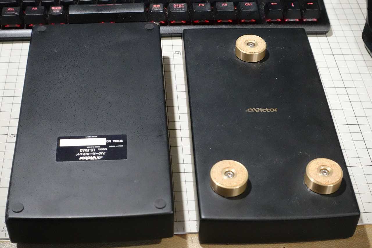 本来、このSPスタンドは EX-A3の為に作られたもので、現在は同じ品物が LS-EXHR99 の型番で販売されています。対象機種は EX-HR9. EX-HR5. EX-N1 / N5 / N50. EX-AR7.EX-AR3. EX-AK1. EX-BR3. EX-BK1. SX-WD30. X-WD9VNT. の為に作られたオプションなのですけど EX-S1 のSPを縦にした時の寸法が 122x155x236 で、このSPスタンドの寸法が 120x43mmx232 で横幅で 2mm と奥行で 4mm ほど出ますが、ほとんどジャストサイズになっているのです。で、本来このスタンドは一万円前後ほどのお値段なのですが、某オークションで半値以下で落札出来てしまい、ウチにやって来る事になったのです。まさか落札出来るとは思わなくてラッキーって言うより「えっマジ?」って感じでした。(;^_^Aまぁ、SPスタンドと言っても 30mm 厚のMDFボードに、真鍮製インシュレーターを組み合わせ、設置側はフエルトが、SP側にはインシュレーター上にコルクスペーサーが貼ってあるだけなので、見た目を意識しなければ、もっと安価に作成する事も可能なのでこの値段で間違って落札出来たら市販のインシュレーターを色々試すより良いかな?って感じで入札したのです。インシュレーターなんで、安く済まそうと思ったら、片側に5円玉を3枚、ペアで \30-から実現可能ですが、専用品としてチューニングされている安心感が有りますし、何より実勢価格で一万円前後する品物ですから、見た目が奇麗で素敵ですね。単体での姿。SP置いたら見えないけど中央にプリントされた「Victor」のロゴが素敵。重量はカタログスペックだと、単体で約 760g との事で、ウチの設置環境だと、MDFボードのご利益がありそうだと思っています。(実際には真鍮製インシュレーターの効果が大きかった)まずは直置きで縦位置に設置して違いを確認してみました。縦置きにしただけでも全体に重心が下がり、音場定位が向上する事を確認できたので、横置きは設置場所の影響を受け易いと言う事かもしれません。最後に今回のSPスタンドを設置してみました。元は横置きSPとは思えない姿に感じます。横幅が 2mm ほど大きいはずなのですが、前面が緩やかなラウンド形状になっているので上記画像だと逆に細く感じるほどですね。実際には「丁度良い」感じで、本当に良い雰囲気です。知らない人が見れば「専用品」と思う事でしょう。奥行も良い感じで、正にジャストサイズ。側面の「ゴム脚」はご愛敬と言う事で。(;^_^A気になる実際の効果ですが、ウチの環境では「効果絶大」でした。入手して大正解です。このスピーカーはヘッドユニットとの見た目のマッチングを無視できるなら、縦置きが「正解」だと思いました。縦置きにしただけでも、低域がの質が向上しつつも量感が増え、音場定位も向上し、人のの声が背景の音に全く埋もれず、とても聴き易くなりました。更に本SPスタンドを介在すると、生々さに拍車がかかります。まるで対面で歌ったり話したりしているような臨場感です。また、真鍮製の脚の成果と言いますか中高域から高域にかけては、美しい響きを伴って奇麗に伸びる雰囲気で、大げさに言えばソフトドームツィーターだけではなくてホーンツィーターまで足した様な奇麗な高域です。(あくまでイメージです)ヴォーカル域でのウッドコーンの艶っぽさに美しい高域を乗せて、低域はバランスを取る為、量感を増やしたような感じです。Apple Music のハイレゾロスレスで聴く Jazz はピアノの高域やシンバルの響きが奇麗ですし低域も向上した中高域とバランスが取れる良い塩梅で量感が増しているので、ウッドベースも良い感じに響きます。小さな 8.5cm SPだと思えばこれ以上ない結果だと思いました。フルレンジSPなのでモニタースピーカーの様に定位が良いのは、ある意味で当然ですけど、JPOP ではヴォーカルに掛けた、リヴァーブやエコーの量とか質まで感じる事が出来ますし、ブレスの吐息までしっかりと聞き取れます。。そして音場は欧州系SPの様にSPの外と奥に広がる感じとなりました。はっきりと言えば「まるで別物」のSPかと錯覚するほどに全てが向上しました。ですが、弱点もあって「ぼっち・ざ・ろっく」の「あのバンド」では、ボッチちゃんが奏でる冒頭のギターソロでエフェクターの効きが強調され、何だかグシャっとして聞こえました。Apple Music のロスレスより Prime VIDEO でアニメを視聴した方が良い塩梅です。では、「ロックが苦手」なのかと言えば「ロックはレディの嗜みでして」のOPは AppleMusic で視聴してもドラムもギターも良い感じで、しかもヴォーカルが埋もれない良い塩梅でした。でも、全般的にアニメの楽曲は Apple Music で聴くよりも Prome VIDEO だったりYouTubeで視聴した方が良好な結果になる事が多いです。今回の設置方法では、ソースのクオリティに対してシビアになってしまったかもしれません。録音が良いとされるアルバムでは非常に良い感じですし、クラシックやJAZZも良いです。ピアノ、女性ヴォーカル、アコースティックギター、ヴァイオリン、金管楽器全般などなど、