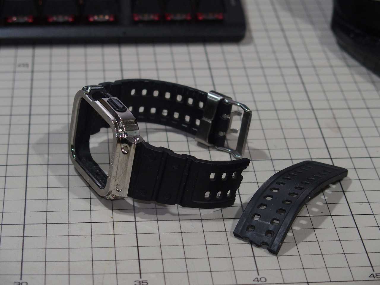 直腸癌の手術で入院する前に購入したブツなので2年以上は経過した事にはなりますが、まさか切れるとは思いませんでした。この AMBAND って、そこそこ人気のあったケースみたいです。このままゴミ箱行きかと思ったのですが、バンド交換できそうな感じです。どうやらダイバーウォッチ用のバンドなら交換できそうな感じの造りでしたので、ダメ元で安価なバンドをポチって見ました。「真夏仕様!」というか、この色が安かったんです。(;^_^A現在は Amazon で一律 \1,000- で各種カラーが販売されていますが、私が購入した時はタイムセールでこの色が安かったのです。ポイントを端数に使って \700- でした。無時に付きました。一応は測って 22mm のバンドを購入したのですが、どうやら 23mm みたいで付属のピンではすぐに外れてしまうので、破損した方のバンド用ピンを使いました。どうやら 24mm のバンドを入手して加工するのが正解のようです。材質はシリコンっぽいです。今年の夏は暑いし、このくらいで派手でも良い感じかと思ったのですが、実物を手に取ってみると微妙にダメっぽいかなぁ。それでも今年の夏は使い倒そうと思います。秋になったら、普通の黒いダイバーウォッチ用バンドにしようかな。。。と思ったのですが、セイコーの純正バンドは高いので Apple Watch 用ケースの方が安かったりするのですよね。何か安価で良さげなバンドを探さなくては。と言う事で Apple Watch ケース(AMBAND)のベルトが切れたので交換してみたお話でした。