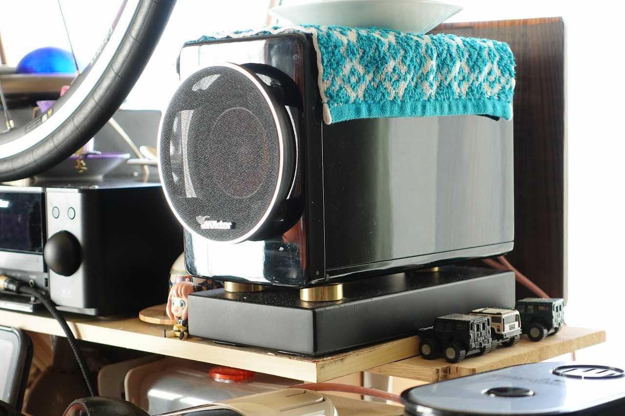 本来、このSPスタンドは EX-A3の為に作られたもので、現在は同じ品物が LS-EXHR99 の型番で販売されています。対象機種は EX-HR9. EX-HR5. EX-N1 / N5 / N50. EX-AR7.EX-AR3. EX-AK1. EX-BR3. EX-BK1. SX-WD30. X-WD9VNT. の為に作られたオプションなのですけど EX-S1 のSPを縦にした時の寸法が 122x155x236 で、このSPスタンドの寸法が 120x43mmx232 で横幅で 2mm と奥行で 4mm ほど出ますが、ほとんどジャストサイズになっているのです。で、本来このスタンドは一万円前後ほどのお値段なのですが、某オークションで半値以下で落札出来てしまい、ウチにやって来る事になったのです。まさか落札出来るとは思わなくてラッキーって言うより「えっマジ?」って感じでした。(;^_^Aまぁ、SPスタンドと言っても 30mm 厚のMDFボードに、真鍮製インシュレーターを組み合わせ、設置側はフエルトが、SP側にはインシュレーター上にコルクスペーサーが貼ってあるだけなので、見た目を意識しなければ、もっと安価に作成する事も可能なのでこの値段で間違って落札出来たら市販のインシュレーターを色々試すより良いかな?って感じで入札したのです。インシュレーターなんで、安く済まそうと思ったら、片側に5円玉を3枚、ペアで \30-から実現可能ですが、専用品としてチューニングされている安心感が有りますし、何より実勢価格で一万円前後する品物ですから、見た目が奇麗で素敵ですね。単体での姿。SP置いたら見えないけど中央にプリントされた「Victor」のロゴが素敵。重量はカタログスペックだと、単体で約 760g との事で、ウチの設置環境だと、MDFボードのご利益がありそうだと思っています。(実際には真鍮製インシュレーターの効果が大きかった)まずは直置きで縦位置に設置して違いを確認してみました。縦置きにしただけでも全体に重心が下がり、音場定位が向上する事を確認できたので、横置きは設置場所の影響を受け易いと言う事かもしれません。最後に今回のSPスタンドを設置してみました。元は横置きSPとは思えない姿に感じます。横幅が 2mm ほど大きいはずなのですが、前面が緩やかなラウンド形状になっているので上記画像だと逆に細く感じるほどですね。実際には「丁度良い」感じで、本当に良い雰囲気です。知らない人が見れば「専用品」と思う事でしょう。奥行も良い感じで、正にジャストサイズ。側面の「ゴム脚」はご愛敬と言う事で。(;^_^A気になる実際の効果ですが、ウチの環境では「効果絶大」でした。入手して大正解です。このスピーカーはヘッドユニットとの見た目のマッチングを無視できるなら、縦置きが「正解」だと思いました。縦置きにしただけでも、低域がの質が向上しつつも量感が増え、音場定位も向上し、人のの声が背景の音に全く埋もれず、とても聴き易くなりました。更に本SPスタンドを介在すると、生々さに拍車がかかります。まるで対面で歌ったり話したりしているような臨場感です。また、真鍮製の脚の成果と言いますか中高域から高域にかけては、美しい響きを伴って奇麗に伸びる雰囲気で、大げさに言えばソフトドームツィーターだけではなくてホーンツィーターまで足した様な奇麗な高域です。(あくまでイメージです)ヴォーカル域でのウッドコーンの艶っぽさに美しい高域を乗せて、低域はバランスを取る為、量感を増やしたような感じです。Apple Music のハイレゾロスレスで聴く Jazz はピアノの高域やシンバルの響きが奇麗ですし低域も向上した中高域とバランスが取れる良い塩梅で量感が増しているので、ウッドベースも良い感じに響きます。小さな 8.5cm SPだと思えばこれ以上ない結果だと思いました。フルレンジSPなのでモニタースピーカーの様に定位が良いのは、ある意味で当然ですけど、JPOP ではヴォーカルに掛けた、リヴァーブやエコーの量とか質まで感じる事が出来ますし、ブレスの吐息までしっかりと聞き取れます。。そして音場は欧州系SPの様にSPの外と奥に広がる感じとなりました。はっきりと言えば「まるで別物」のSPかと錯覚するほどに全てが向上しました。ですが、弱点もあって「ぼっち・ざ・ろっく」の「あのバンド」では、ボッチちゃんが奏でる冒頭のギターソロでエフェクターの効きが強調され、何だかグシャっとして聞こえました。Apple Music のロスレスより Prime VIDEO でアニメを視聴した方が良い塩梅です。では、「ロックが苦手」なのかと言えば「ロックはレディの嗜みでして」のOPは AppleMusic で視聴してもドラムもギターも良い感じで、しかもヴォーカルが埋もれない良い塩梅でした。でも、全般的にアニメの楽曲は Apple Music で聴くよりも Prome VIDEO だったりYouTubeで視聴した方が良好な結果になる事が多いです。今回の設置方法では、ソースのクオリティに対してシビアになってしまったかもしれません。録音が良いとされるアルバムでは非常に良い感じですし、クラシックやJAZZも良いです。ピアノ、女性ヴォーカル、アコースティックギター、ヴァイオリン、金管楽器全般などなど、