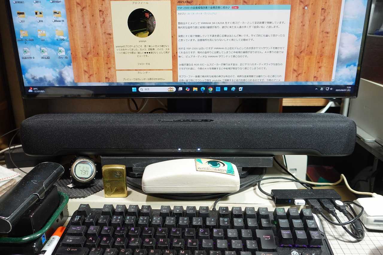 普段はPCメインで YAMAHA SR-CA20A をPC用スピーカーとして至近距離で視聴しています。現代的な音作り故に低域の量感があり、遊びに来た友人達の多くが「音良いね」と話します。27" ディスプレイだと「ジャストサイズ」です。実際にPC前で視聴していて不満を感じる事はほとんど無いです。サイズ的にも選んで良かったなと思っています。設置場所も気にならないしPC用としてお勧めです。対する YSP-2500 は古いですが YAMAHA の上位モデルとして古き良きヤマハサウンドを聴かせてくれるのですが、現代の音作りと比較してしまうと中低域の量感が足りません。AV寄りの音では無く、ピュアオーディオな YAMAHA サウンドって感じなのです。16個が連なる Φ28 のビームスピーカーが繰り出す音は、正にヤマハのオーディオライクな音なのですがそれ故に、今時のAVを視聴すると中低域が物足りなく感じてしまうのです。サブウーファー装備で絶対的な低域の伸びは有るので、純粋な音楽視聴では優れていると感じられる良い音で特にクラシック等を youtube で視聴すると迫力を感じられるのですが、今時のアニメ視聴にはどうも物足りないと感じます。帯域の広さは十分に感じられるのですけどバランスがAV向きでは無いように思います。ワイドな帯域の優れた音源以外だと「コレで本当にスーパーウーファー鳴ってるの?」って感じになる事さえあります。クラシック(オケ)の視聴では帯域の広さを感じられますが、AVの視聴で低域の迫力を感じ難いのです。メインのサウンドバーとSWの繋がりが今時の音作りにマッチしていない感じです。良く言えばフラットに低域が伸びてはいるのですがAV視聴ようとしては、もう少し「ドンシャリ」な感じの方が好ましいのです。当時、純正で販売されていた「サラウンド用反射板」を使用したり、サラウンド環境の整った部屋で視聴すれば異なる結果となるのかもしれませんが、ウチではそんな感じなのです。専用アプリとSWのボリューム調整でバランスを調整しても限界を感じます。個人的には、SWが受け持つ帯域が調整可能になっているか、メインに繋ぎ用ウーファーが搭載されていれば良かったのにと思ってしまいます。サブウーファーの置場所の強化も行ってみました。以前はとりあえずって感じでアルミのパンチングメタルをモニタースタンドの脚部に載せて仮止めした上にサブウーファーを載せて居たのですが、試しに合板の上に載せてみたら低域の量感と質が変わったので、まずは真面目に設置場所の強化を行う事にしました。具体的には20mm厚のパーチクルボードでベースを作り、更に床材用の12mm厚の合板を引き出しの滑り止め用に「100均」で売っているメッシュシリコンを挟み込んで木ビスで固定しました。クラシック(オケ)の音(バランス)が良くなったのは、このベース強化の影響が大きいです。この時点で、かなり改善されたのですが中低域から低域のボリュームがもう一声欲しいです。と言う事で、更に 21mm 厚の合板を追加しました。どうやら、サブウーファーの設置スペースの強度?が低域の量感に大きな影響を及ぼすようなので改善策として更に 21mm 厚の合板に黒いガムテープを巻いて追加してみました。その効果は予想以上に絶大で、人の声にまで影響が出るほどに、サブウーファーの受け持ち帯域が広くなって、更には音量も増えたのです。正直な話、サウンドバーのオマケなサブウーファーって事でなめてました。私の設置方法が誤っていただけで YSP-2500 は、現代でも通用する素晴らしいサウンドバーの元祖だと改めて実感しました。と言う事で iPad に入れた専用アプリで詳細設定をやり直しました。結果は SR-CA20A のドンシャリ感とは異なる、かなり「ガチ」な低域の量感を確保する事となり、youtube にアップされている「TOP GUN」のOPとか、ボリュームを上げていくと身体に感じる衝撃がなかなか心地良いです。最近のアニメですと「ロックは淑女の嗜みでして」のオープニングで連打されるバスドラの迫力が出ています。この作品は主役のバンドが「インストバンド」なので楽器演奏の迫力が作品の品質に大きく作用しますので、一般的にはヘッドホンかイヤホンを使い、それなりの音量で視聴する事を強くお勧めします。ウチだとPC(27"ディスプレイ)& YAMAHA SR-CA20A の組み合わせで中音量で、それなりに楽しめていましたが、今回のサブウーファー設置ベースの強化で YSP-2500 &42"モニターで音量を上げてで視聴すると、特に最終回は「ライブハウス」の臨場感に浸る事が出来ました。正直な話、かなり楽しいです。私はAV作品の「サウンドデザイン」が気になる方なので、お気に入りの作品を改めて視聴したくなりました。近所の建売現場で、断りを入れ頂いて来た建築廃材の有効活用をした訳ですが、結果オーライと言うか大成功でした。 それなりの量の廃材を頂いて来たので「サラウンド用反射板」についても検討してみたいですが、それはまた別のお話と言う事で。。。