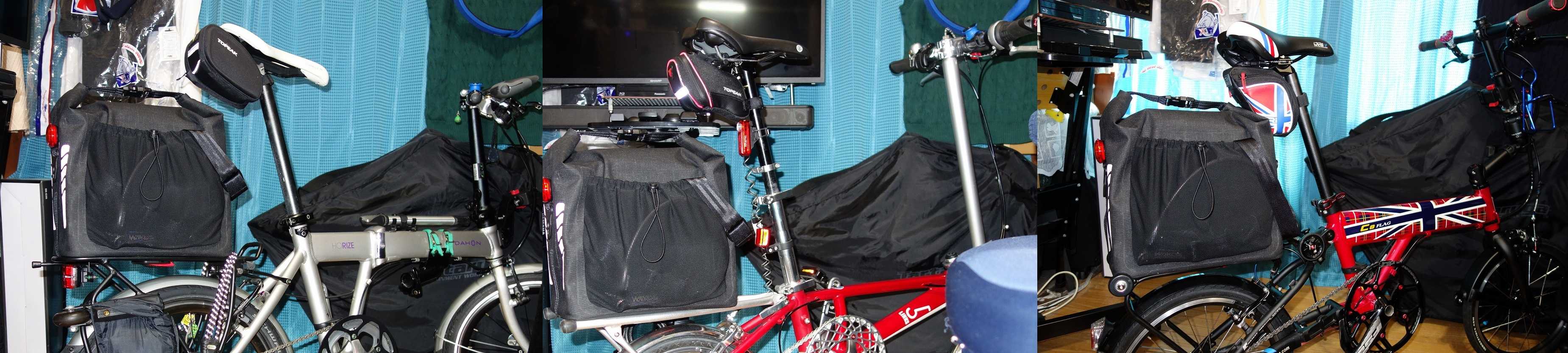 9月も後半になって、やっと涼しくなってきましたね。その分、急な雨も多くて自転車での移動はお天気との相談が必要ですので、本格的に自転車に乗るのは10月になってからかなぁ。一日の気温差が激しいので皆さんも体調管理にはお気を付け下さいませ。今回はリアキャリアの天板にワンタッチで取り付けるTERN KORI BASKET(KLICKfix)をゲットしたお話です。多くの方達は KLICKfix と言うと RIXEN & KAUL のフロントバスケットやフロントバッグを思い起こすのでしょうけど、その分、似たような製品も多いです。まぁ、代表作とは言えるでしょう。個人的に KLICKfix で優れモノだと思っているのは、リアキャリアの天板に取り付けるバッグや、バスケットの初期タイプです。現在では KoebKlip や UniKlip に置き換わってしまっていますし、リアキャリア天板ワンタッチ取付の代表作は取り扱いショップが多く入手が容易でリアキャリアが「簡易リアフェンダー」としても機能する TOPEAK の MTX シリーズでしょう。採用メーカーは特にないのですが、日本では圧倒的に入手が容易なので使っている方も多いと思います。家でも過去には VENNTANA に対応リアキャリア装備して Tarutaruuga にはアタッチメントを取付て MTX 対応リアバッグを使っていましたが、現在はどちらも手放しています。で、新たに入手した e-Bike である Votani H3 は中古ゆえに、純正の MIK 対応リアキャリアが装備されていたので MIK 対応のリアバスケットとバッグを入手して使ってます。 MIK システムはトレックとジャイアントが採用していてバジルもアタッチメントやバッグを販売してい居るので海外では使用率が高そうですが、日本ではバジルを扱うショップが少ないので一般化は厳しいかもしれません。個人的には上品な作りのバスケットが気に入っていますけどね。一方で、初代 KLICKfix 対応製品を現在でも販売している唯一のメーカーとして Tern があり、その製品が DRY GOODS BAG です。初代リアキャリア天板対応 KLICKfix のメリットは特別なベース等が無くとも多くのリアキャリアにワンタッチで「ポン付け」出来きて、しかも互換性が極めて高い事が最大の特徴です。家でも3台の自転車に「ポン付け」出来ています。画像左の DAHON Horize は Tern 純正リアキャリアですから当然ですが、画像中央の 5Links2 165のメーカー純正リアキャリアにも OriBike C8 Flag に付けた Brompton 互換の中華製リアキャリアにも「ポン付け」出来ています。そして脱着の容易さは初代 KLICKfix が一番だと思います。*メーカーHPより。で、今回入手したのが、この初代 KLICKfix に対応した Tern KORI BASKET です。こちらは既に廃番製品で、現在は KoebKlip を採用した Market Basket 2.0 が販売されています。底板の tern のロゴが素敵です。今回はアルミ製バスケットと言う事で DRY GOODS BAG の様に底板に柔軟性が無いので、底板周辺のクリアランスが厳しくてスペーサーを入れて調整しています。多少の加工はしましたがシッカリと装着出来ました。ギリギリ故にシッカリと付いています。正直に話すとリアキャリアのゴム脚部分がバスケットの脚部に干渉して取付出来なかったので、画像右の 5Links2 リアキャリア脚部を 2cm ほどカットしています。フォールディング時にはスタンドが有るので特に問題は有りません。ホイールが小さいのでサドルバッグとのクリアランスも十分で目一杯荷物を積めそうです。このバスケットをメインで運用するのは 5Links2 165 になりそうです。キャリアのホイールを外してギリギリで着きました。此方もかなりクリアランスは厳しいですが、その分シッカリと付いています。キャリアのホイールを生かす場合はバスケットの底板をカットする事になるので ORiBike C8 Flag で使用する場合は、その都度、キャリアホイールを外して運用しようと思います。輪行時にバスケットを使う事は無いので、こちらも無問題です。おかげで純正の組み合わせの時に、少し緩いフィット感になっています。本来は「ポン付け」となる純正の組み合わせですが、スペーサーを入れた事で脱落するほどではないのですが緩めのホールドになっていますが、自己責任の範疇で良しとしました。キャリアに付けているゴムベルトが良い感じでクリアランスを調整してくれて結果オーライです。とは言え、 ORiBike C8 Flag と DAHON Horize ではサドルバッグとのクリアランスがギリギリで取付時に少し手間取ります。外すのはワンタッチですけどね。以前に購入し Votani H3 に取り付けた BASIL CENTO TECH FIBER MIK は上品な雰囲気でしたけど TERN KORI BASKET はワイルドな雰囲気で、それが各車両にマッチしていると思いますが特に 5LINKS2 165 とのマッチングが良いので専用って感じになりそうです。と言う事で、今回もレアで欲しいと思っていた「ブツ」を廃番故に安価に入手出来て大満足です。