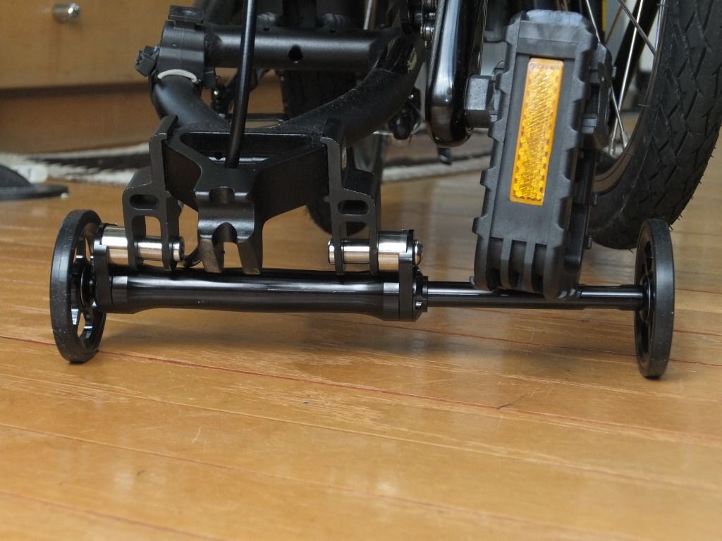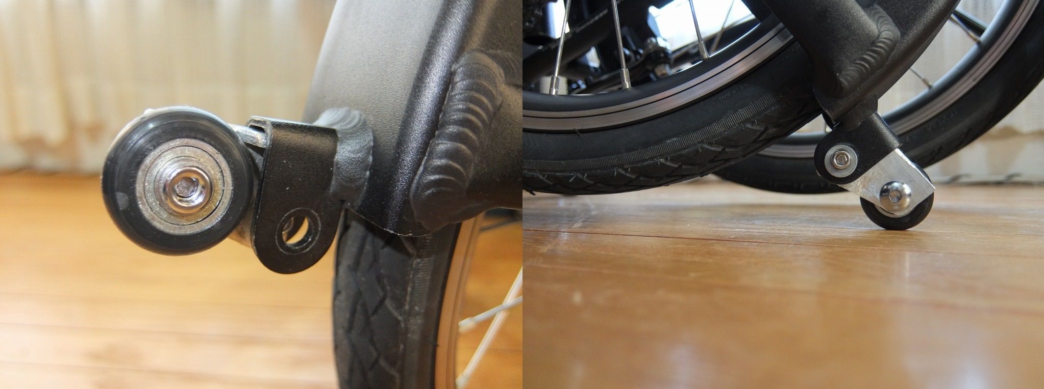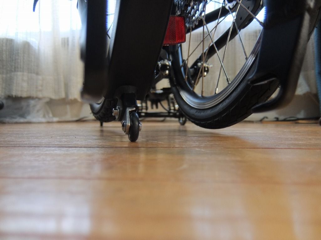 路面とのクリアランスは一般的な舗装路なら必要にして充分で「お座りスタイル」での押し歩きも可能です。もちろん自作アンダーカバーを付けた輪行状態で快適に転がせます。自作アンダーカバーは地面と擦れたりするでしょうから、ある意味では消耗品扱いですかね。