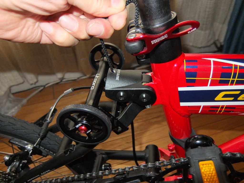 基本ブロンプトン用ですが良い塩梅に取付できました。ですが上記画像のように車軸が貫通する様になった事で、インスタントリバウンドキャッチの操作がとても不便になってしまいました。