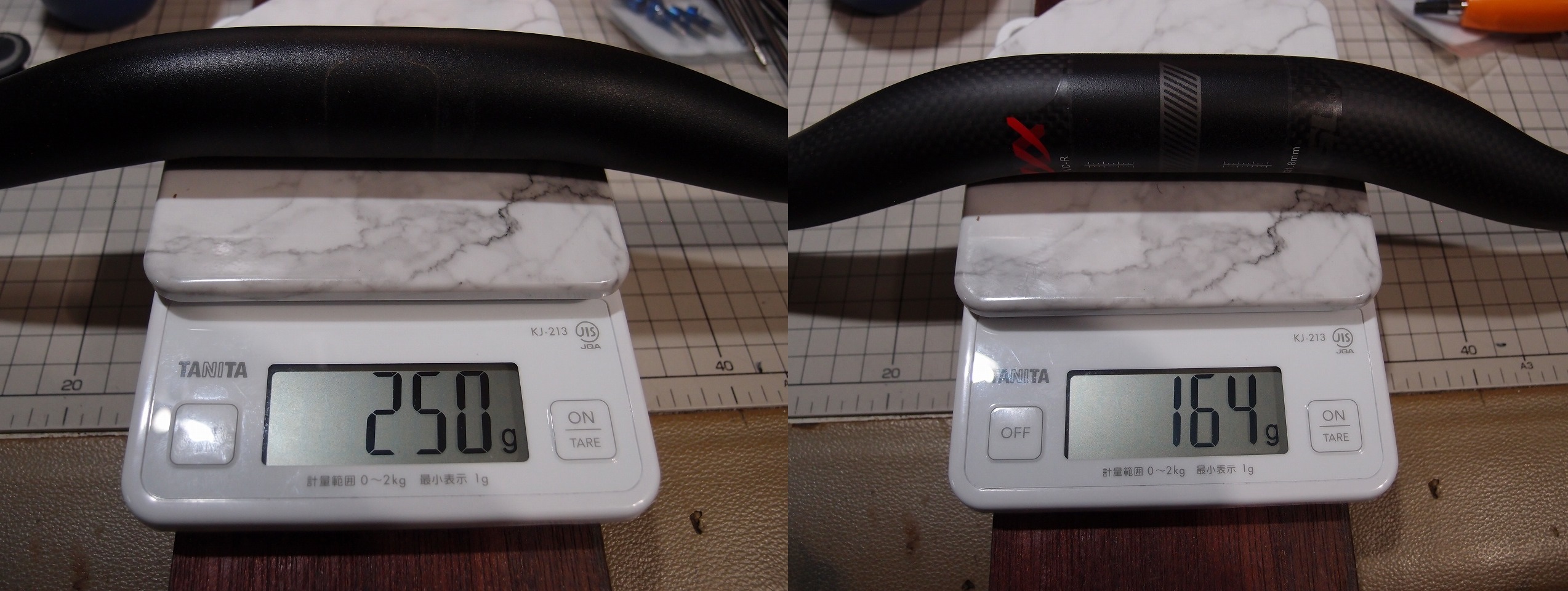 外したアルミ製ライザーバーと、カーボン製ライザーバーの重量差は 86g でした。