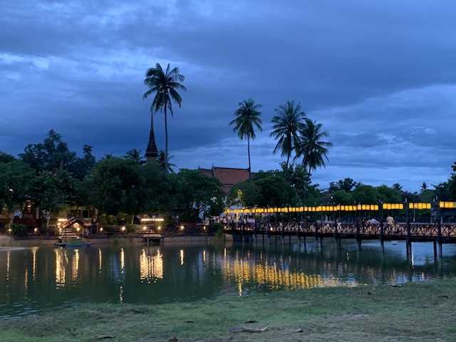 2025/08/27/水曜日/秋を知りたい◼️ 8/14 夕焼けどうでしょう日が傾き始めた頃、水に浮かぶワットサシーを再び訪れた。夕焼けを背景にした仏さまが格別ときく。残念ながら見事な夕焼け、というシーンにはならなかった。タイは今、雨季なのである。今まですこぶる好天に恵まれたのが奇跡的と言っても良いのだ。ところが坐仏に近づくと、西の空が柔らかいオレンジと黄色、タイの仏教カラーがさしてきた。低木の梢という梢には白鷺厳かで静かで自分の中心点も鎮まるような日が沈む直前、坐仏が浮き上がるような錯覚をもつワットサシーを離れ、振り向けば日没の入日は刻々と色彩を変化させる。明日が平和で美しい日となることを約束するような日の名残り荘厳なひと時が過ぎれば、やがてナントカ落としの時間になる、のも面白い。昨晩、この周辺の屋台で買い食いのつもりが、結局ホテルのプールで相客になった人が教えてくれたSureerat Restaurant ร้านอาหารสุรีรัตน์ โภชนาという食堂へ行ってみることに。私たちの前には誰もいなくてがらーんとしていた。本当に人気?でもまあ、そこそこ美味しいねぇ、などと話している内、あれよあれよと満席に。欧米系観光客に人気らしい。飲み物はシンハービア。シンハーはタイで虎の意。沖縄のシーサーと同じ、語感も近い。そこに海洋民族のつながりを確かに覚える。私のDNAの塩基の一部に確かにあるだろう、海原の民の、海の水への近しさ。