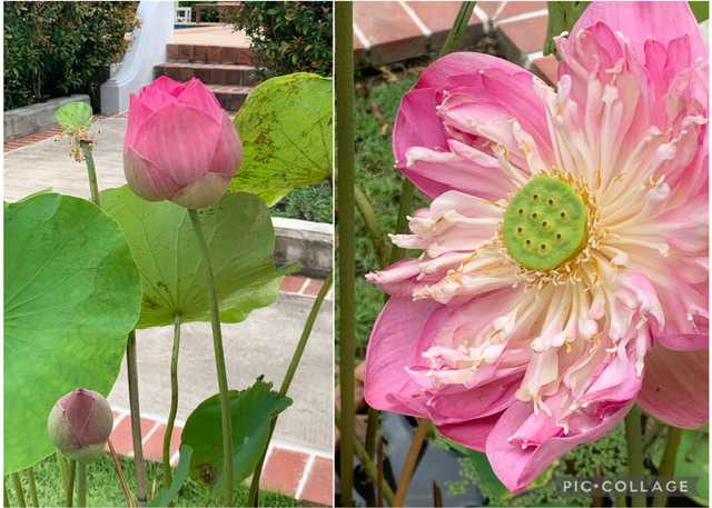 ↑左、昨日朝の蓮のつぼみ。右、今朝は開いた。