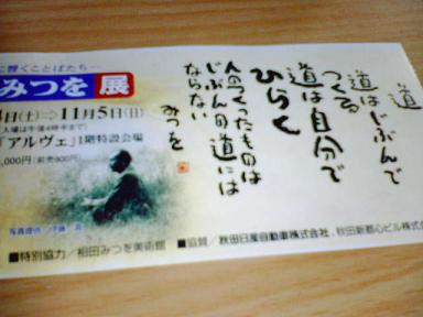 相田みつを展にいってきました~。夫と私と2歳の甥っ子と3人で。到着したのは16時30分くらい。17時までだったので、ぎりぎりセ-フでした。言葉のひとつ、ひとつが心に響いてきますね。ビデオなんかもみることができて、感動でした。我が家の玄関にも相田さんの言葉、飾ってあるんですよ。その言葉は「幸せは自分の心がきめる」です。確か、結婚のお祝いに仲良しのMちゃんから頂いたものです。夫、甥っ子、私と3人、手をつないで相田みつお展みてました~。2歳になる甥っ子には退屈でくずんないかなあって思ったのですが、なんとかクリアできました。夫が甥っ子に、みつおさんの言葉を2歳児ように、保育園児の人生が。。。とかなんとか、おもしろおかしくして説明して~~~(汗)なぜか甥っ子、Sっぴ、真剣な顔つきで聞いておりました。こら~~~!変なこと教えるなってば(怒)Sッピは乗り物が大好きでバスをみにいって。。。そして帰ってきました~。行きも帰りも、とっても元気よく、きゃっきゃ!!と騒いできた3人でございます。帰ったらママが迎えにきてました。ママの会社、このところ忙しくて残業続き。ママにあえて嬉しそうなSっピです^^