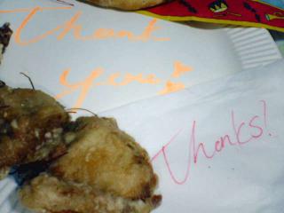 土曜の夜。夫と私が一緒に夕食を楽しむのは、あまりありません。土曜日のレッスンが終わってから、自分のピアノ練習をして夜、遅くなってから自宅に戻ったり。日曜日までいて自分の練習をしてから帰る事も。生のGPが自宅にはないのです(泣)自宅のピアノはかなり昔に購入した古い電子ピアノ君。あ~。だけど電子ピアノでも今は、とってもステキな演奏をする人もいますよね。なのですが、レッスン室のGP君、やっぱり一番かわいい私です♪自分の練習をするのもピアノ教師の大事な仕事の一つ。気楽に遊んでいるわけではなく。。。それでもって今日は土曜の夜。私のレッスンは、発表会のためお休み。ついこの間、ランチにいったお店にまたまたでかけちゃいました。もちろん今日は生パスタ~。美味しかった♪帰ってから夫と二人宴会やろう!!って事になって~。メニュ-にピザがあったのでテイクアウトしちゃいました。夫が食べたいといって鳥のから揚げもテイクアウト~。ちゃんとしたラッピングが出来ないけれどもいいですか?と店員さんにきかれて~。いいですよ~などと答えて~。ワガママいってすみません~と一言、伝え、自宅で二人宴会をはじめようと、テイクアウトしたものをあけてみました~。そこにはTanks!と手書きでかかれてて~。夫も私も感動~。しかも、から揚げス-パ-美味しい!お腹だけじゃなくって心もまんぷく~何度でもいきたくなるお店なのです♪
