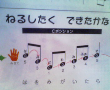 レッスングッズ。C、D、E、F、G、A、Bの7つのカ-ドを使用しています。この英語のカ-ドは、かな~り前に、100均から買いました~。ダイソ-でよくみかける、あの英語のやつです。音程。音と音の距離。2度音程、3度音程のあてっこクイズをしました。C(ド)とD(レ)やE(ミ)とF(ファ)の音程は2度。鍵盤おとなりステップですね。そしてC(ド)とE(ミ)やG(ソ)とB(シ)の音程は3度。鍵盤ひとつとばしてスキップ~です。定規で長さは何センチってはかるのと同じようなものだよって小さい子には、言葉かけしてます。どの英語カ-ドからでも、ステップ、2度あがると何の音?スキップ3度あがると何の音?このクイズが、フラッシュで答えられるようにするという練習。鍵盤が高い音に上がるだけではなくて、低い方に下がると何の音?も頑張っています。高い音へ~は鍵盤は右に進み~。低い音へ~は鍵盤は左に進む~。右、左ってのが、ポイントだったりします^^このゲ-ムC(ド)から順番に上がると英語CDEFGABCイタリア語ドレミファソラシド日本語ハニホヘトイロハこれを逆からもスラスラ答えれるように~もゲ-ムしてます。 (これも、C(ド)からばかりでなく色々な音から~を練習してます^^) 英語 CBAGFEDCイタリア語 ドシラソファミレド日本語 ハロイトヘホニハ音名のバイリンガル~^^でこの日本語。ハロイトヘホニハっていうのが、なんだかおもしろい響き?で~。☆ちゃんと大爆笑~~~。なんだか、幼い頃、自分の名前を逆から読んで~ってのを思い出した私でした。このゲ-ム、5線の読譜につながる最初の一歩^^