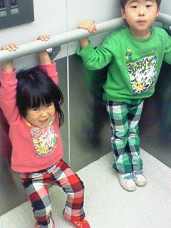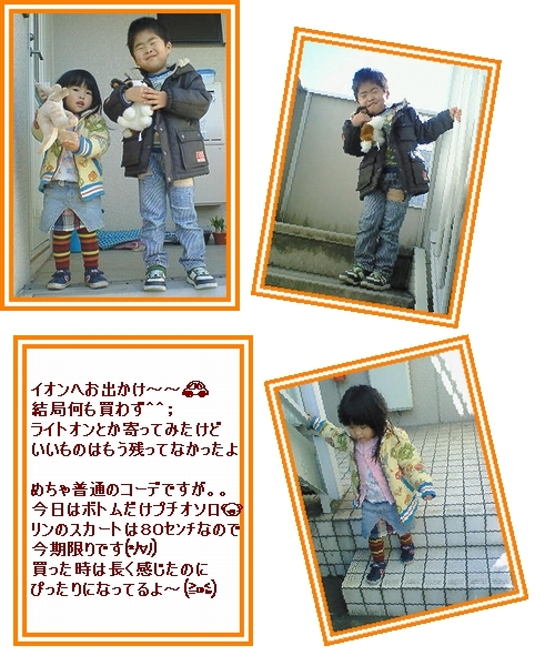 本日1回目の日記です 昨日は旦那が飲み会だったので私もビール(といっても発泡酒)を飲んじゃったよ前はビールまずいと思ってたけど、最近ちょっと美味しいと思ってしまうおっさん化かしら(笑) さて昨日は3人で歩いて大きいスーパーへ行ってきたよいや~風が強くて途中帰ろうかと思ったけど、結局ユウはずっと歩いて(リンはバギー)スーパーにも4時間近く滞在してました エレベーターの中での二人トップスはベリーズベリー、ボトムスはF.Oブロックチェックパンツこのパンツ本当に大活躍ユウは身長106センチで110、リンは身長90センチで90着用。リンの身長の伸びが意外に早くて95を買っておけばな~とプチ後悔でもユウが履いていたレッド100があるんだった来年いけるかな~~ マックとミスドでお昼~ゲーセンでもちょっと遊んだよ乗りたい乗りたいうるさかったのでこれだけ乗せたよ そして、今日の着画です二人とも新春福袋に入っていたコーデ ユウのトレーナージャストだよね今期限りガンガン着せないと~~リンは袖折ってますそうそう、女の子Aに入っていたピンクのカーデ、一回洗濯したら一番上のボタンが取れた(´Д`;A)ま~福袋のだから縫製甘いんだろうけど。。自分でつければいいんだけど、赤の糸だったのですぐにはできず。。まだ外れたままです^^;糸買ってこないと