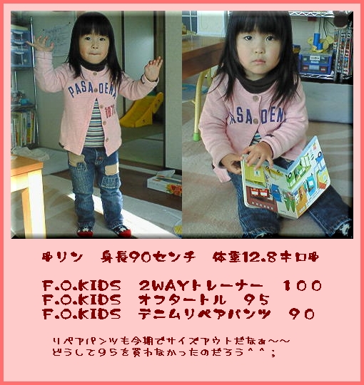 本日1回目の日記です 今日は久々にリンと一緒にお昼寝しちゃったユウが冬休みに入ってから全然お昼寝しなくなっちゃって。。。今日は体操教室だったから疲れたみたいこのままお昼寝しなくなったらいやだな~~もうそろそろ眠いのでさらっと着画だけ リン 身長90センチくらい 体重12.5キロくらいF.O リバーシブルジャケット 100F.O PASADENAトレーナー 95F.O ショートパンツ 90F.O ボーダースパッツ M どうよううたのえほんお気に入りです 全部歌えるようになったよおもちゃのマイクを持って熱唱してます(笑) 夕方ちょっとコンビニへ~~ ブサイクユウ 身長105センチくらい 体重17.5キロF.O リバーシブルベスト 120F.O 新春福袋BOYS-Aトレーナー 110 かえるスリッポンも履いてみたよやっぱりちょっと大きいみたいでもユウは気に入ってて明日も履いていくって言ってたよ秋物っ♪60%OFFっ!F.O.KIDSリバーシブルベスト1218円60%OFFだって~~~安っ