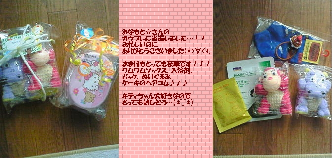 本日1回目の日記です 今日からめずらしく旦那が3連休なので、日中PCする時間がないよ~~でもまた背景とか替えてみたり^m^ コティママさんのプレゼント企画に当選昨日届きましたなんだか私もやってみたくなったんだけど、もう今頼んでもバレンタインには間に合わなかった両親に送るのもいいな~~ コティママさんこんなにかわいいプレゼントほんとうにありがとうございました☆