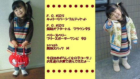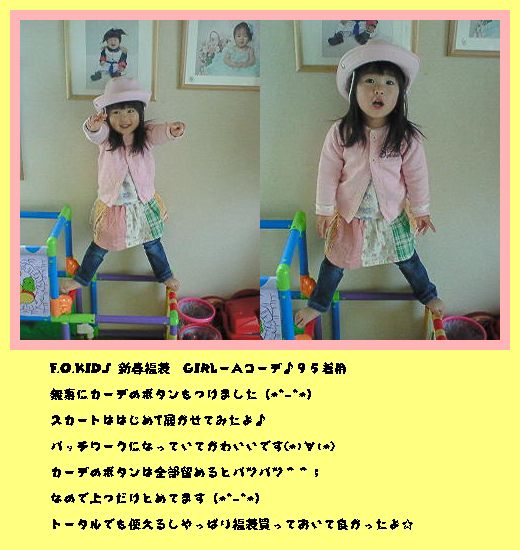 本日2回目の日記です ★☆着画 新春F.O.KIDS福袋 GIRL-Aよかったら見てくださいね~~ 赤ちゃんデパートニワ楽天市場店FO KIDSパンツ3本セット2007年の秋冬品番より春でも着用できそうな生地のパンツをセットにしました。(コール天やベロアなどの厚地は入れてません)品番は秋品番ばかりになるか冬品番も混ざるかは特定できません。 コール天やベロアが入らないんだね~~ちょっと気になる。。
