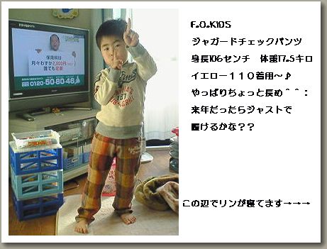 本日1回目の日記です 年末に子供服&おもちゃの店リッカティルさんでポチってたジャガードチェックスカートをはかせてみたよ う~~ん、ちょっとこのコーデは失敗だなっていうかスカートが長すぎやね リン 身長90センチ 体重12.5キロF.O リバーシブルジャケット 100F.O PASADENAトレーナー 95F.O チェック切替シャツ 90F.O ジャガードチェックスカート 95seraph スパッツ MF.O ボーダーレッグ S ユウにはパンツをポチ済み イエロー 110スカート90でよかったなぁ~~~思いっきりひざ下だし。。ユウも110買ったからきっと長いだろうなぁ~^^;
