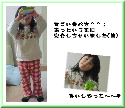 本日2回目の日記です 今日は寒いし雨だし旦那も仕事だし。。ってことで引きこもってたよ~~特にネタもないし着画もないの~~^^;今日のリンはこんな感じでした~さぁちゃんさんのカウプレのオマケだったお菓子食べてます^m^ 必死だね(笑)ちなみにメニューは、ハンバーグと野菜スープだよ(*>∀<*)スープには荒挽きポークウィンナー(1kg) を入れたよ~いいだしがでてめちゃおいしいよ リンは割りと好き嫌いなくなんでも食べます~^^(ユウもだけどw)変わったものもスキです^m^お漬物とか鶏皮とか。。。おつまみ系??こんぶ、ひじき、わかめ、のりとかの海藻も好きwお刺身も大好き~野菜は根菜類が好きみたいにんじん、ジャガイモ、大根など。。。ブロッコリーはマヨネーズつけたら1株は食べちゃうくらいスキ(笑)離乳食全然食べないって悩んでたのがうそみたい
